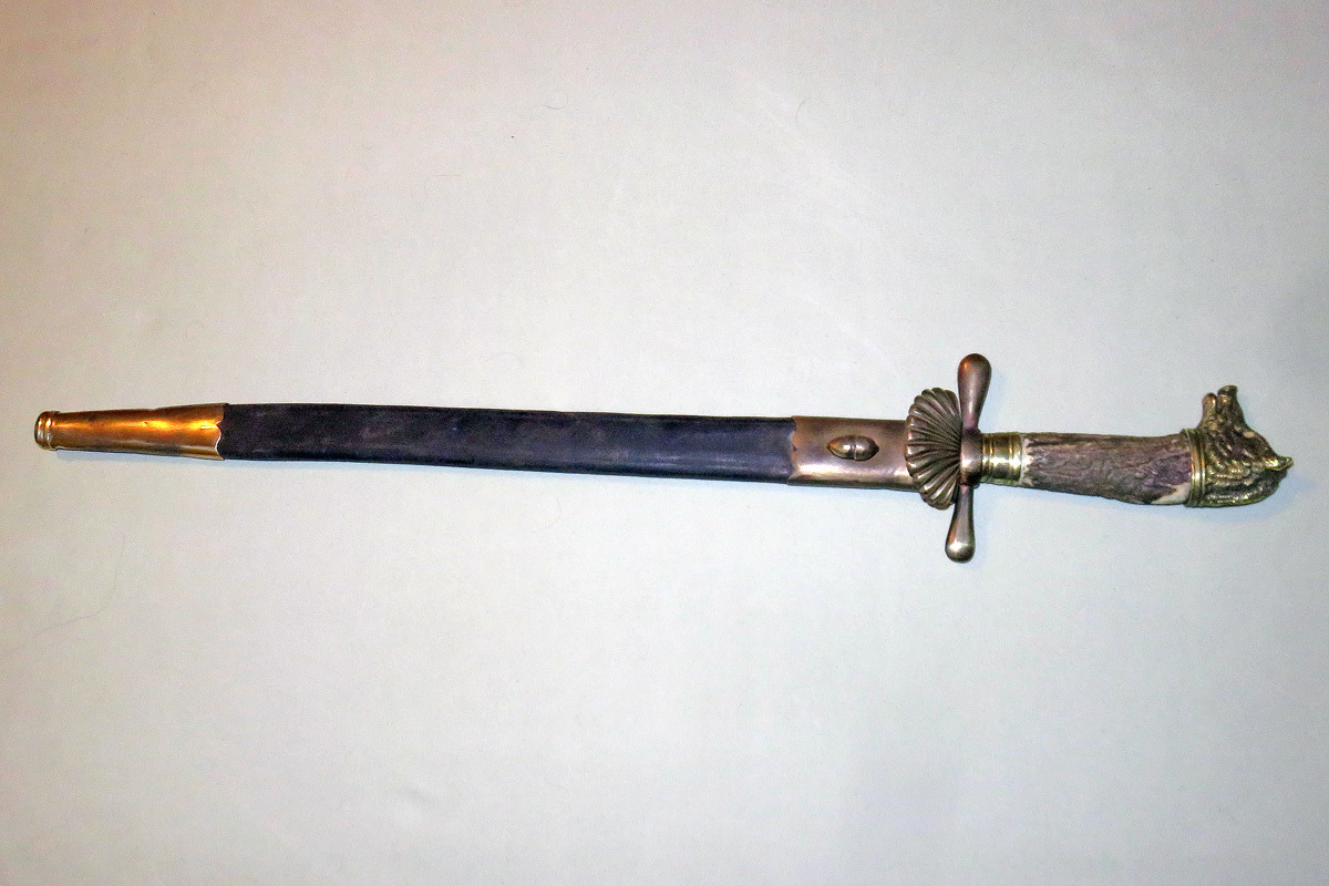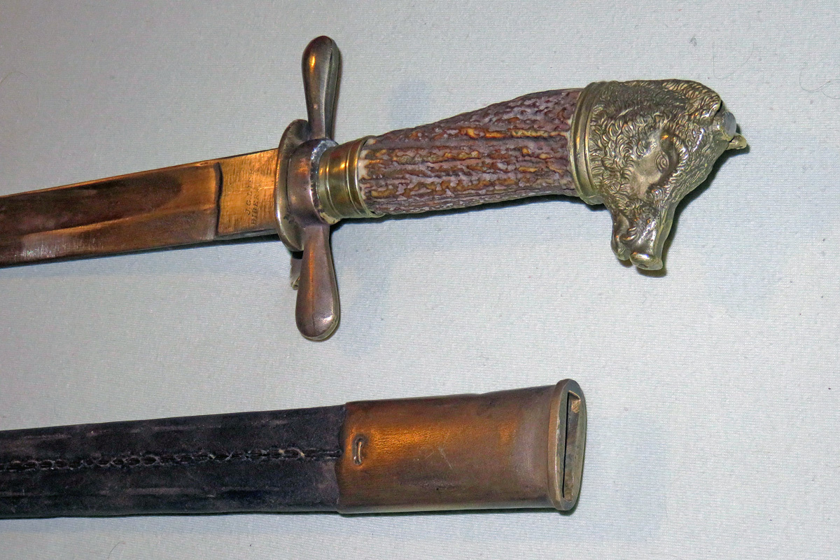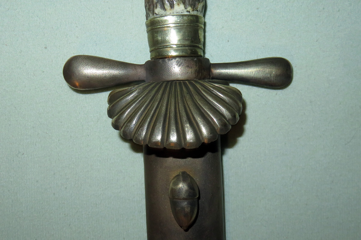 Alter Hirschfänger mit Messingmontierung, Hirschhorngriff und schwarzer Scheide.