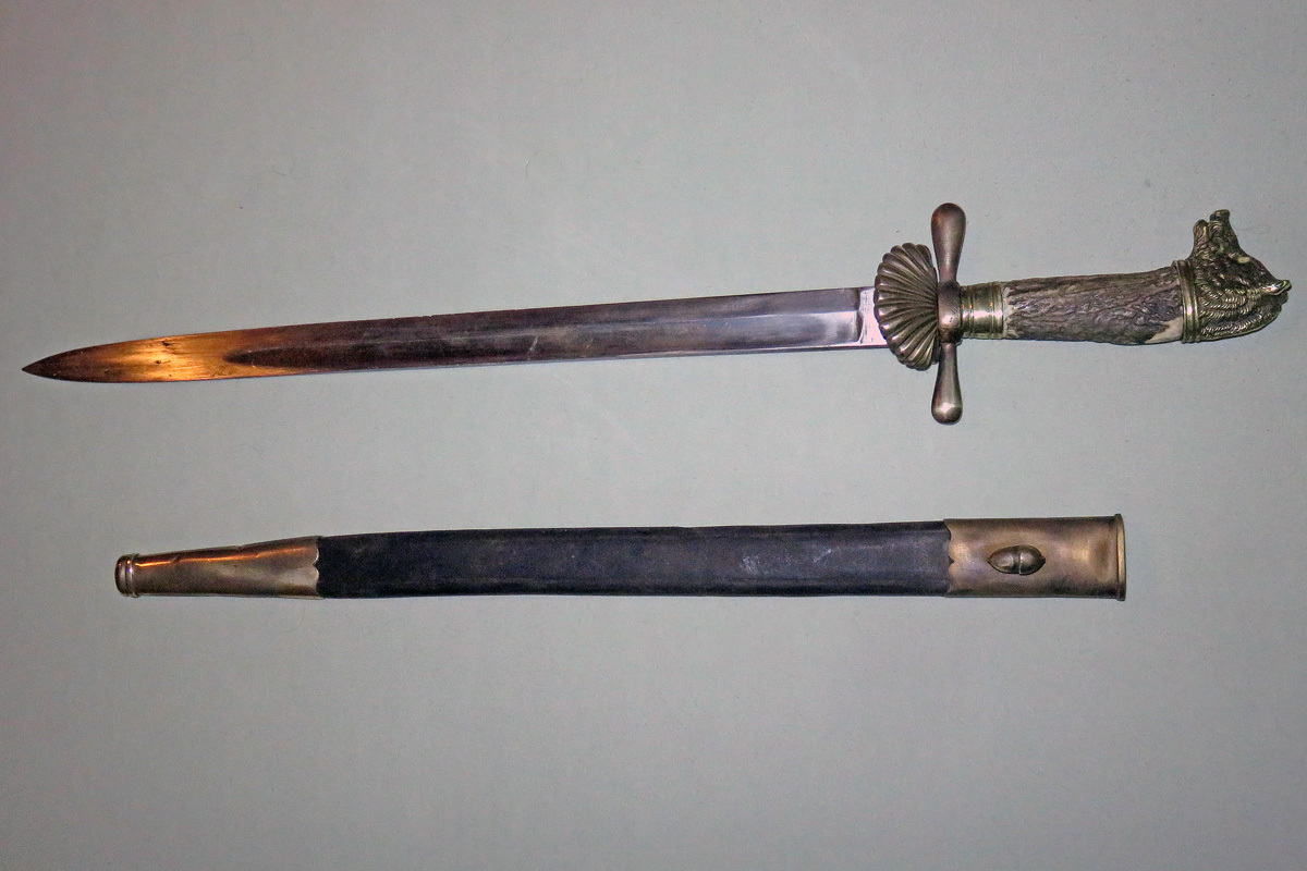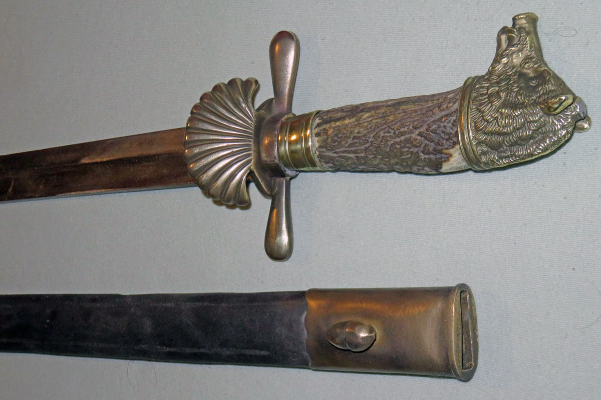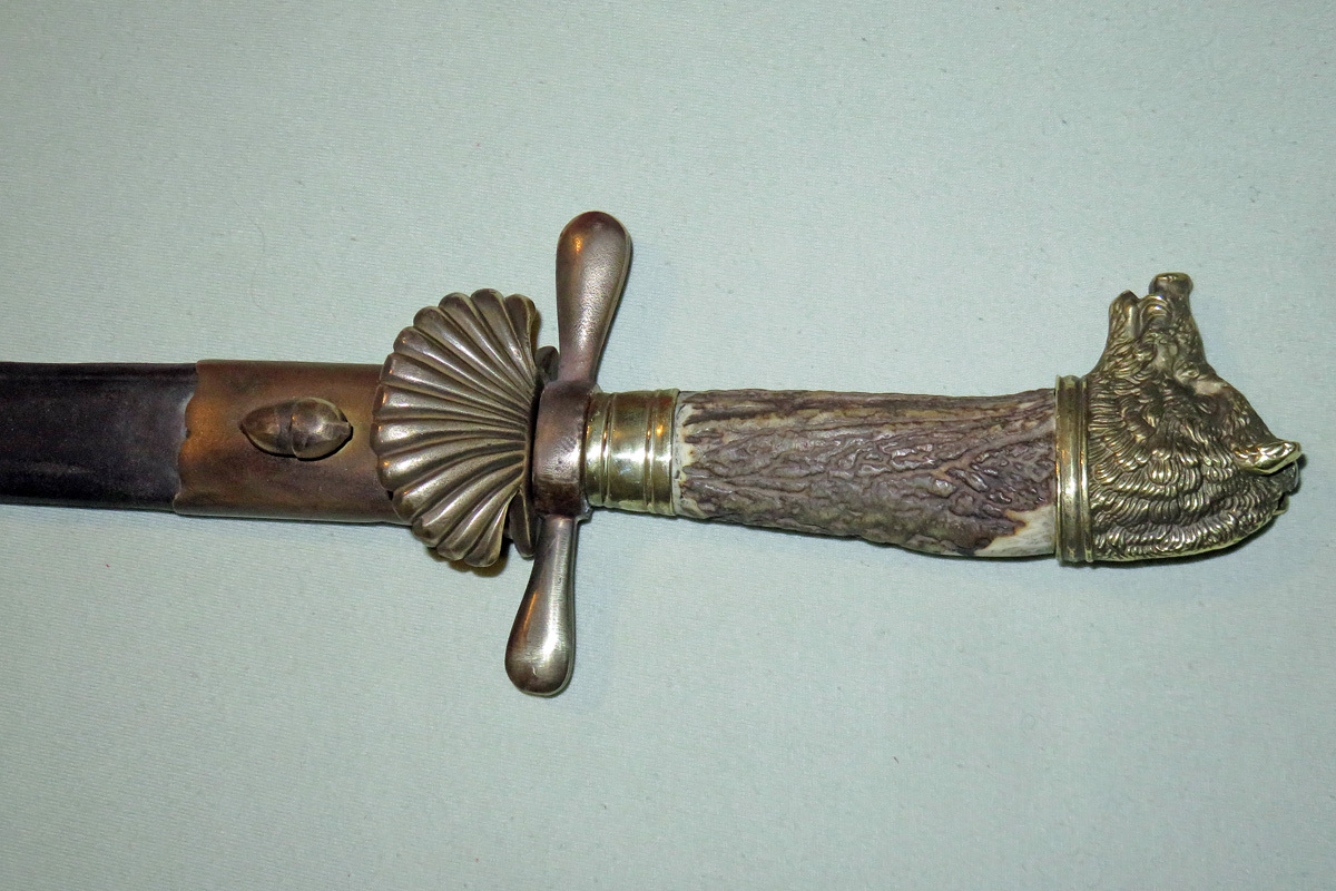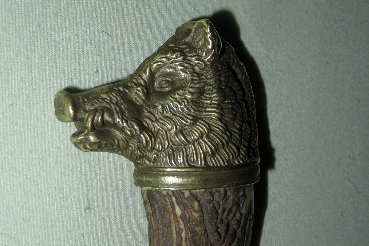 Wildschweinkopf als Knauf, Parierstange und Stichblatt in Muschelform.