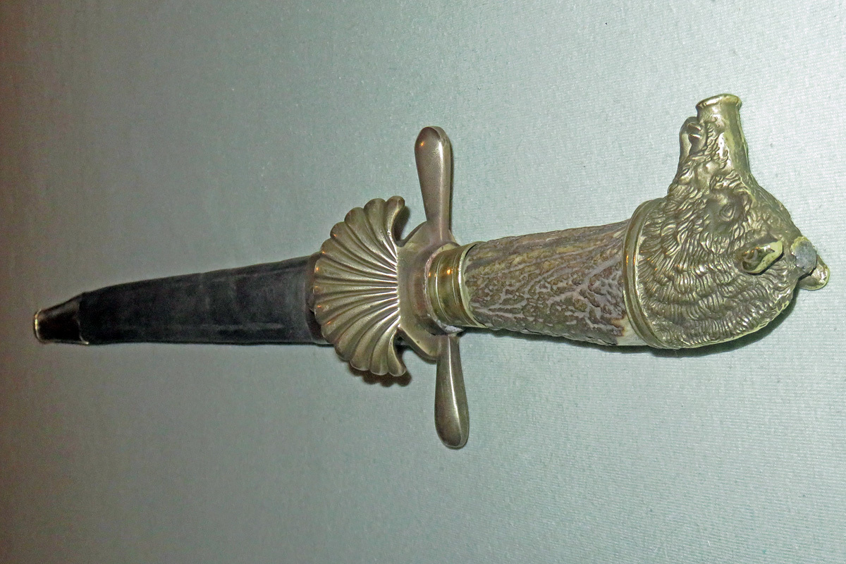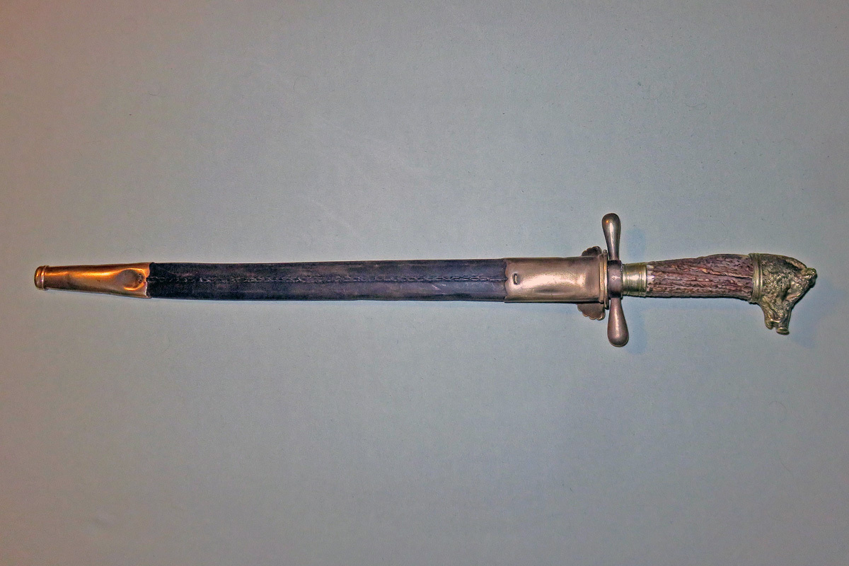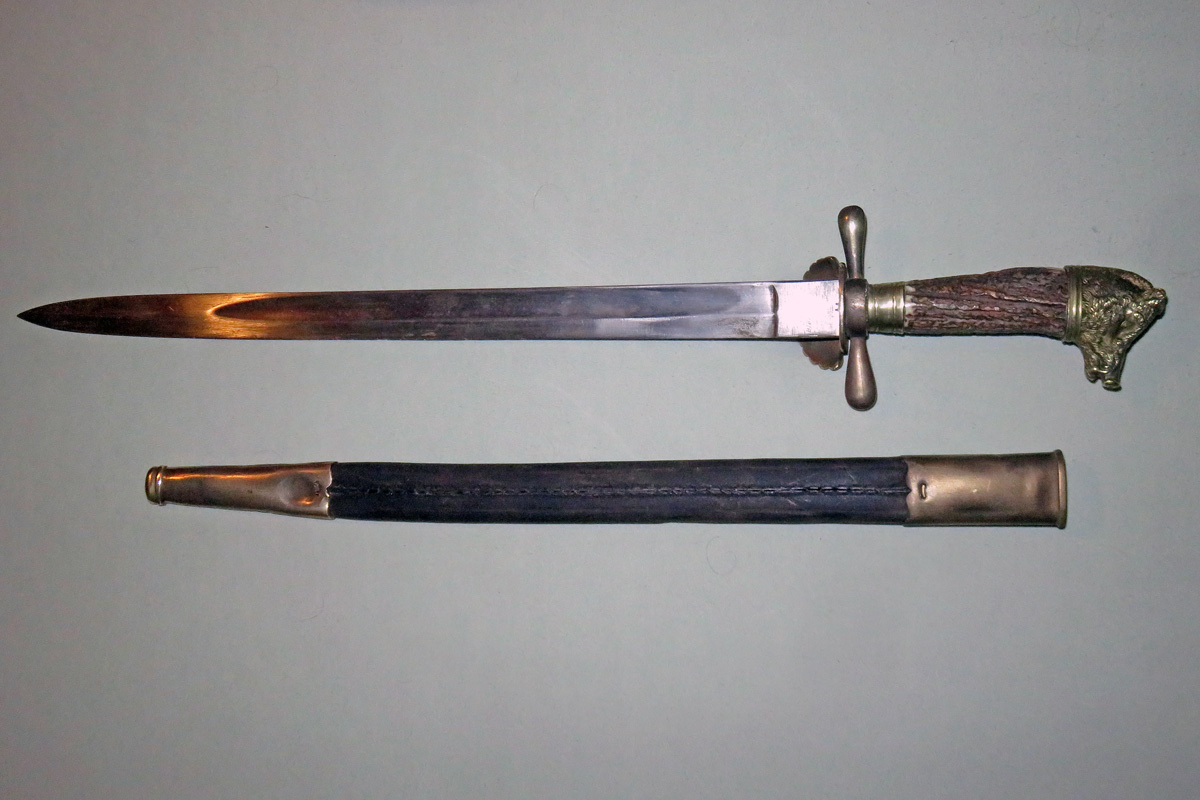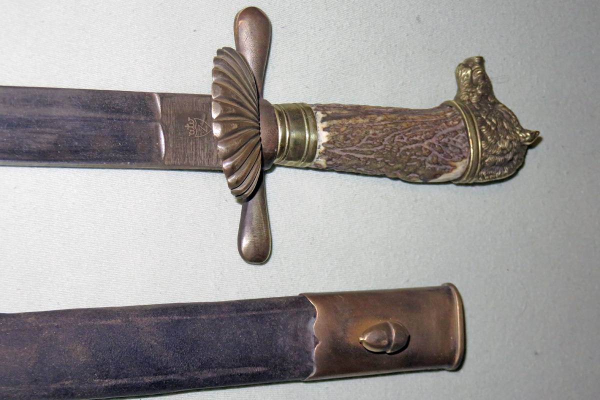 Wildschweinkopf als Knauf, Parierstange und Stichblatt in Muschelform.