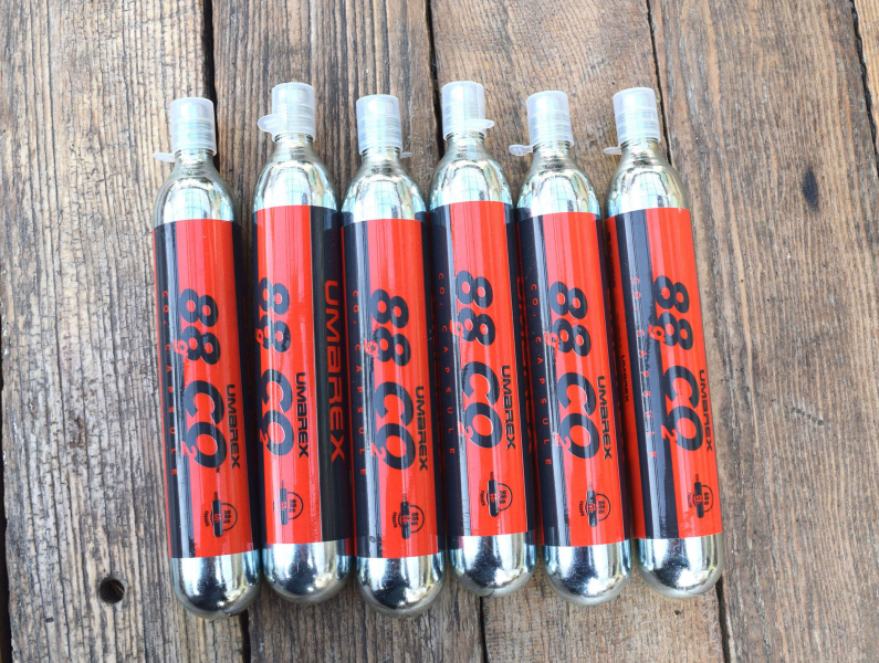 Es wird dieses kleine Paket an sechs 88g Kapseln für CO2-Gewehre angeboten.