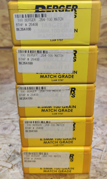 Zum Verkauf kommen 500 St. Berger Geschosse .264/6,5 100 Grain Match Grade Target BT.
