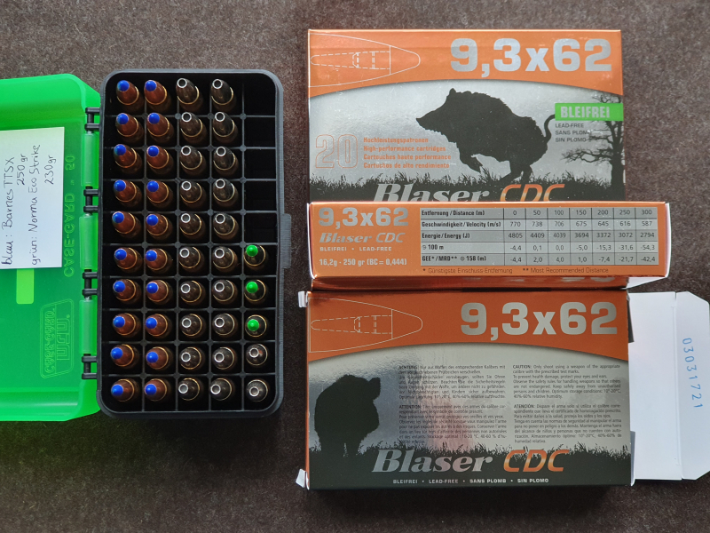20 Schuss Barnes TTSX 250 gr., 22 Schuss RWS Cineshot und 3 Schuss Norma EcoStrike 230 gr. - in der Munitionsbox.