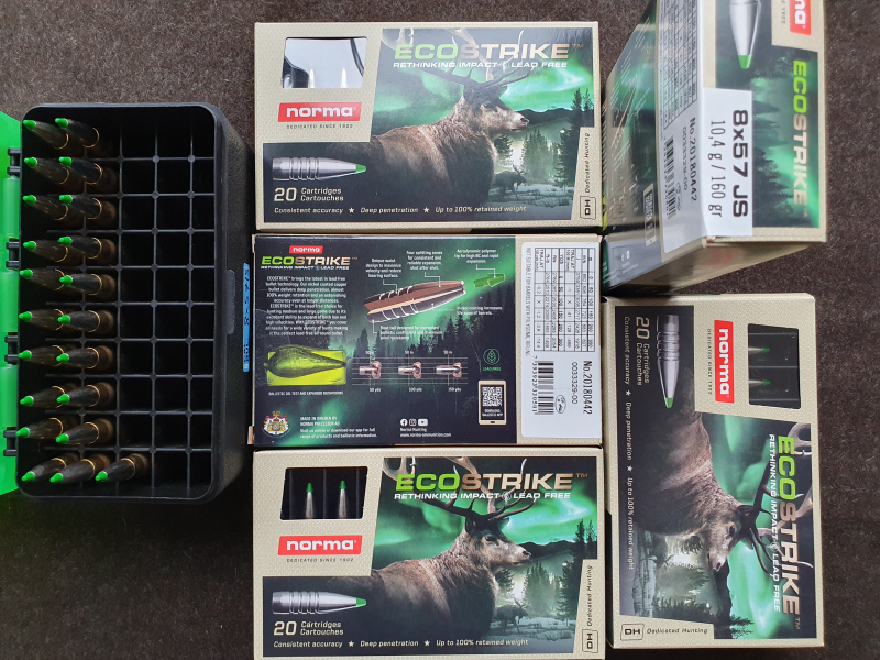 121 Schuss Norma EcoStrike 160 gr. - in 5 ungeöffneten Originalverpackungen und in der Munitionsbox, alles losgleich.