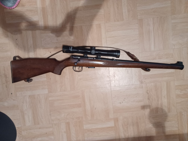 Gut erhaltener Anschütz Stutzen 1518 .22 Magnum mit Riemen und Walther Zielfernrohr, guter Zustand, siehe Bild