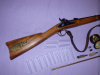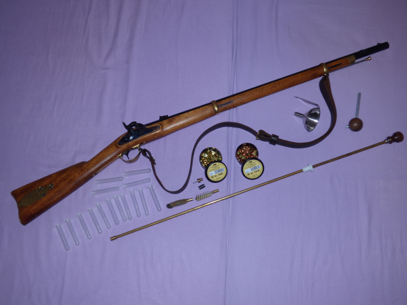 Messing-Patchbox, Gewehrriemen aus Leder, Bajonetthalterung. Das Gewehr wurde aktiv geschossen ist aber in insgesamt noch gutem, gepflegten Zustand. Der Ladestock des Gewehres ist nicht mehr der originale (ging mal verloren und wurde ersetzt). Die ursprünglich vorhandene Klappkimme wurde vom Vorbesitzer durch eine feste Kimme ersetzt, das Korn etwas heruntergeschliffen. Vermutlich ist das Visier auf 100 m eingestellt, denn auf 50 m schießt das Gewehr etwas zu hoch. Auf 100 m kann ich es leider nicht testen, da wir im Verein nur 50 m Bahnen haben.Mit dabei ist das Zubehör auf den Fotos: 15 Pulverröhrchen mit unverlierbarem Deckel, Ein Messingladestock (in 3 Teile zerlegbar), Kugelzieher, Pflasterzieher, Nylonbürste, Wollwischer, Edelstahltrichter,Kugelstarter und je ca. 100 Flügelzündhütchen 1081 und 1281.