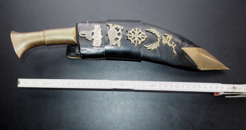 Dieser Kukri, komplett mit Scheide, wurde in den 1970-er Jahren von einem Gurkha Soldaten in Hongkong persönlich erworben. Der Soldat hatte in Kowloon Spielschulden in einem chinesischen Dschunken-Restaurant und versetzte sein Kampfmesser als Sicherheit. Ich habe ihn nie wieder in Hongkong getroffen.