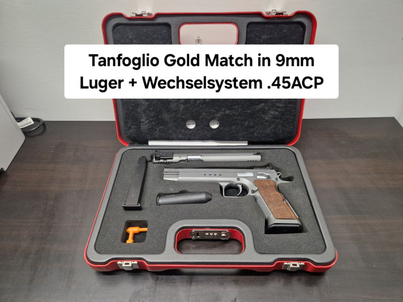 Verkaufe meine Tanfoglio Gold Match im Kaliber 9 mm Luger (6 Zoll) inklusive Wechselsystem im Kaliber .45 ACP.