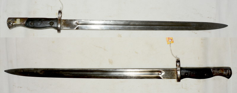 Ich denke, es handelt sich um eine Variante des englischen Bajonetts Mod. 1907, zum Unterschied zu den Abbildungen des engl. Bajonetts ist der Knaufabschluss zu den Griffschalen allerdings schräg, es befindet sich auf der Waffe nur ein "I" in einem Kreis auf dem Heft, das könnte für Indien stehen,, Klingenlänge 43,4cm, Gesamtlänge 57,7cm, der Mündungsringdurchmesser beträgt 16,5 mm, gebrauchter Zustand, es ist keine Scheide dabei