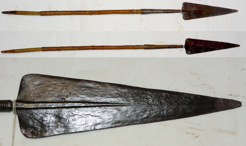 Original afrikanische Lanze, Gesamtlänge nur 93,5 cm, Spitze mit Tülle 38,5 cm, Klingenbreite unten 63 mm, der Schaft zu 3/4 mit dickem, geschmiedetem Kupferdraht umwickelt, an der Spitze 2-3 Millimeter umgeschlagen, gut sind die Schmiedemarken auf der Klinge zu erkennen, guter altersbedingter Zustand