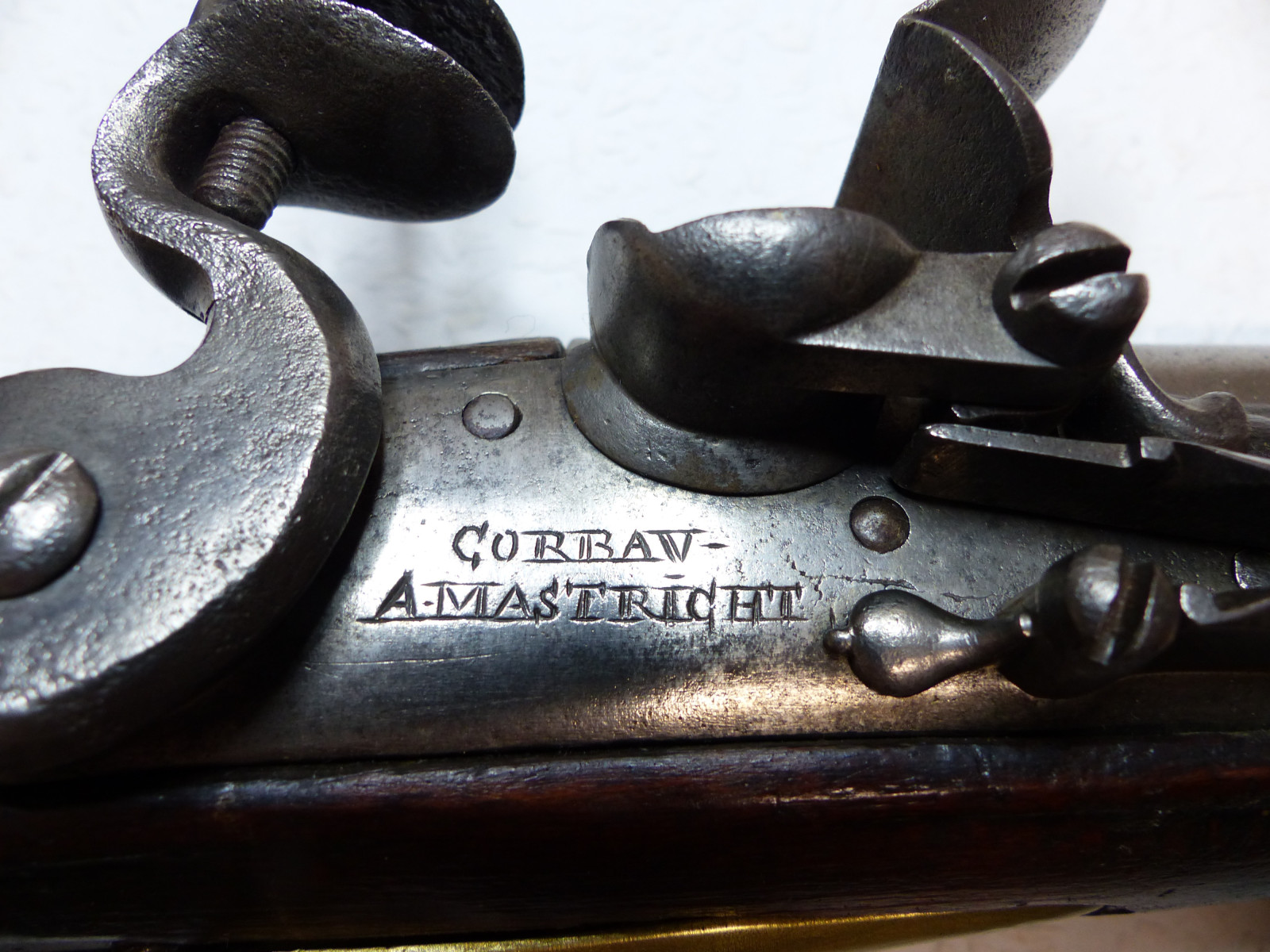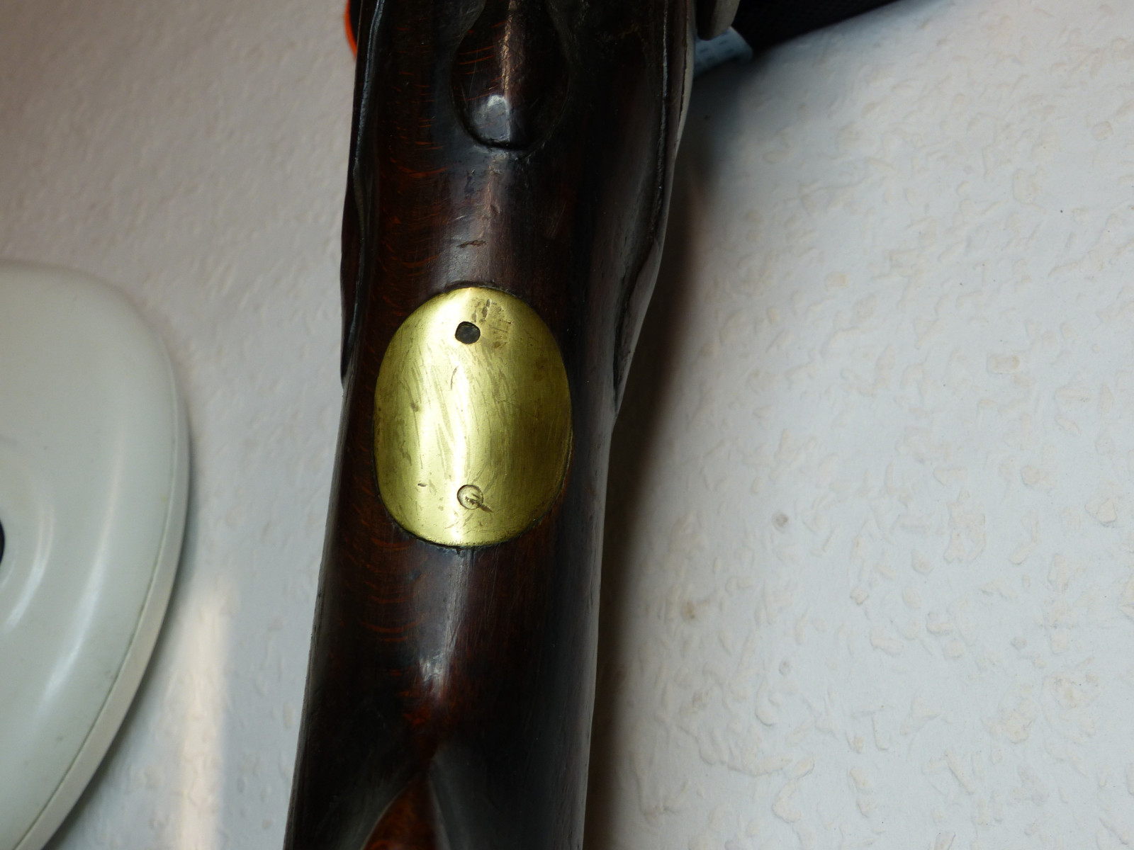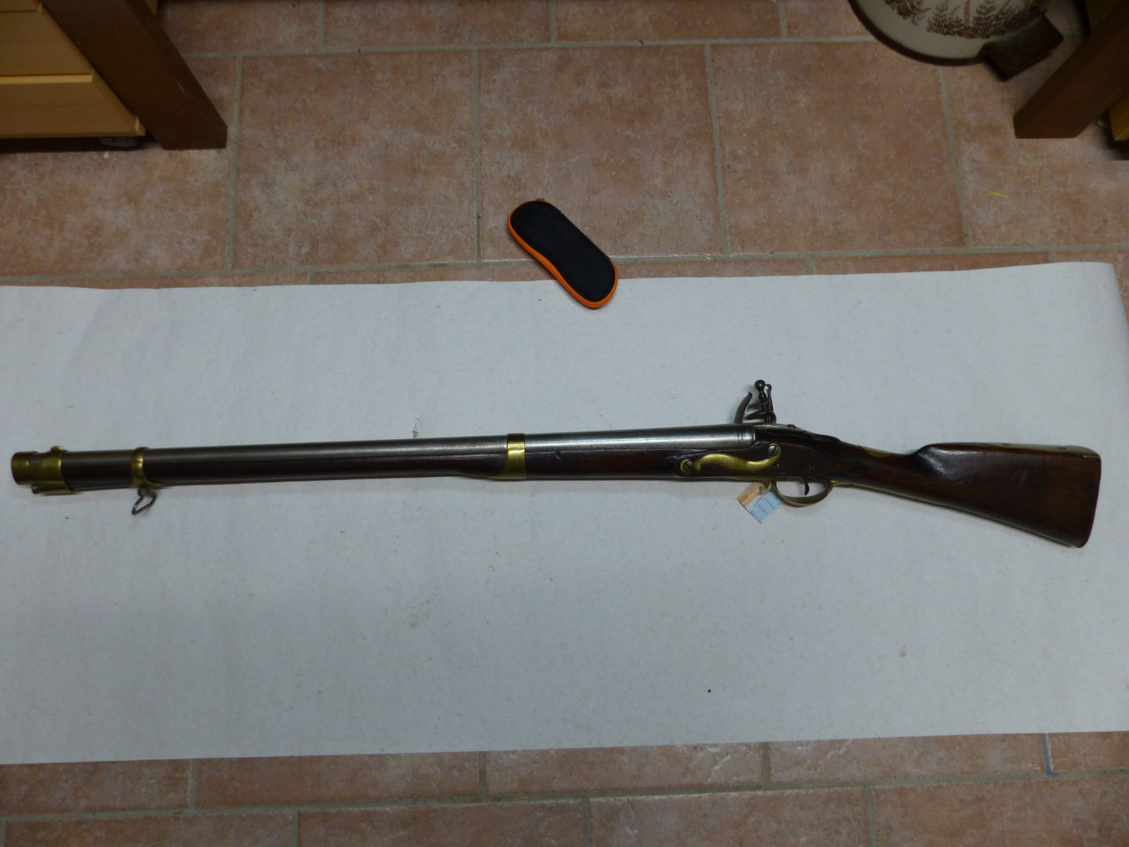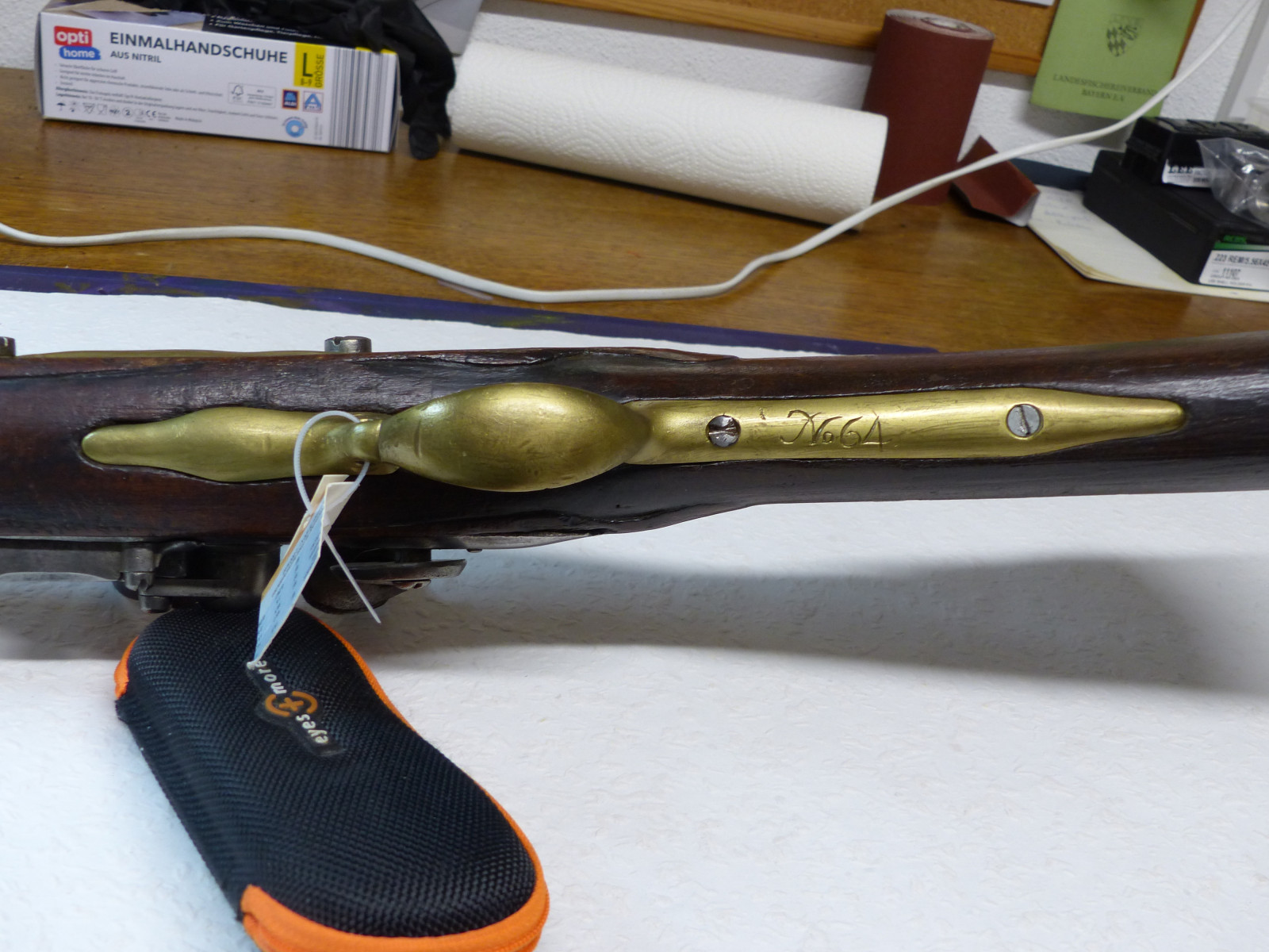 Sie bieten auf ein echtes historisches Gewehr mit Steinschlosszündung. Das Gewehr wurde lt. Aufschrift auf dem Schlossblech vom Büchsenmacher CORBAU-A-MASTRICHT gebaut. Bei meinen Recherchen zu dem Gewehr fand ich nur wenig Informationen, lediglich ein Artikel eines amerikanischen Sammlers beschrieb diese Waffe. Dem zufolge handelt es sich um einen niederländischen Büchsenmacher aus Mastricht (andere Namensschreibweise CORBEAU). Diesem Artikel zufolge wurden entsprechende Gewehre häufig in Amerika verwendet, zu einer Verwendung in Europa fand ich keine Artikel. Auf dem Messingbeschlag unter dem Abzug ist NO 64 eingeprägt, ob es sich um eine Gewehrbezeichnung oder eine militärische Angabe handelt, weiß ich leider nicht. Die Angaben auf der Messingplakette und dem Schulterbeschlag sind leider nicht mehr vernünftig lesbar. Der Hammer ist leicht wackelig auf der Achse, rastet aber in die Sicherheitsrast und die Abschussrast ein und lässt sich auch auslösen. Die Batterie ist funktionsfähig. Der Ladestock ist vorhanden. Es fehlt nur die hintere Befestigung für den Gewehrriemen. Interessant ist die Konstruktion des Schaftholzes, dieses ist leicht nach links abgewinkelt. Das Holz weist altersbedingte Kratzer und leichte Dellen auf, Risse oder ähnlich schlimme Beschädigungen hat das Holz nicht. Das Gewehr hat eine Gesamtlänge von ca. 117cm, der Lauf ist ca. 80cm lang, der Laufinnendurchmesser beträgt ca. 19mm (was das für ein Kaliber ist, weiß ich leider nicht. Die Waffe hat schöne Messingbeschläge und ist meines Erachtens eine Zier für jede Waffensammlung, ich denke, es ist eine in Europa seltene Waffe. Ich muß darauf hinweisen, dass das Gewehr nicht über ein Deutsches Beschusszeichen verfügt, bei einer Nutzung des Gewehrs übernehme ich keine Verantwortung. Noch ein Hinweis: Ich versende nicht ins Ausland. Ggf. kann die Waffe persönlich abgeholt werden. Als Erwerbsvoraussetzung ist lediglich ein Alter von 18 Jahren - das wird vermutlich nicht mehr lange so sein. Der Versand erfolgt über GLS, das Gewehr wird in einer Holzkiste versendet.