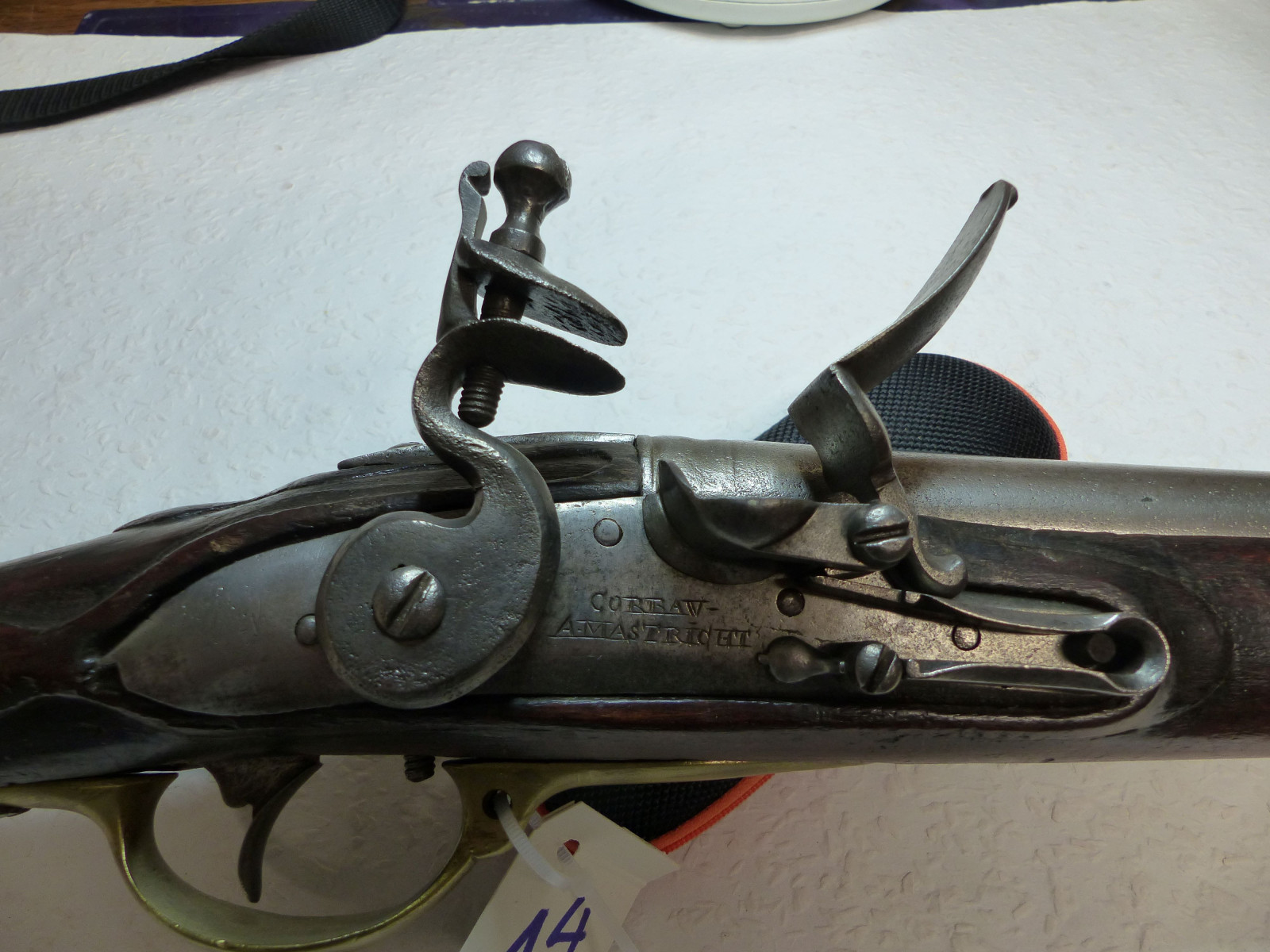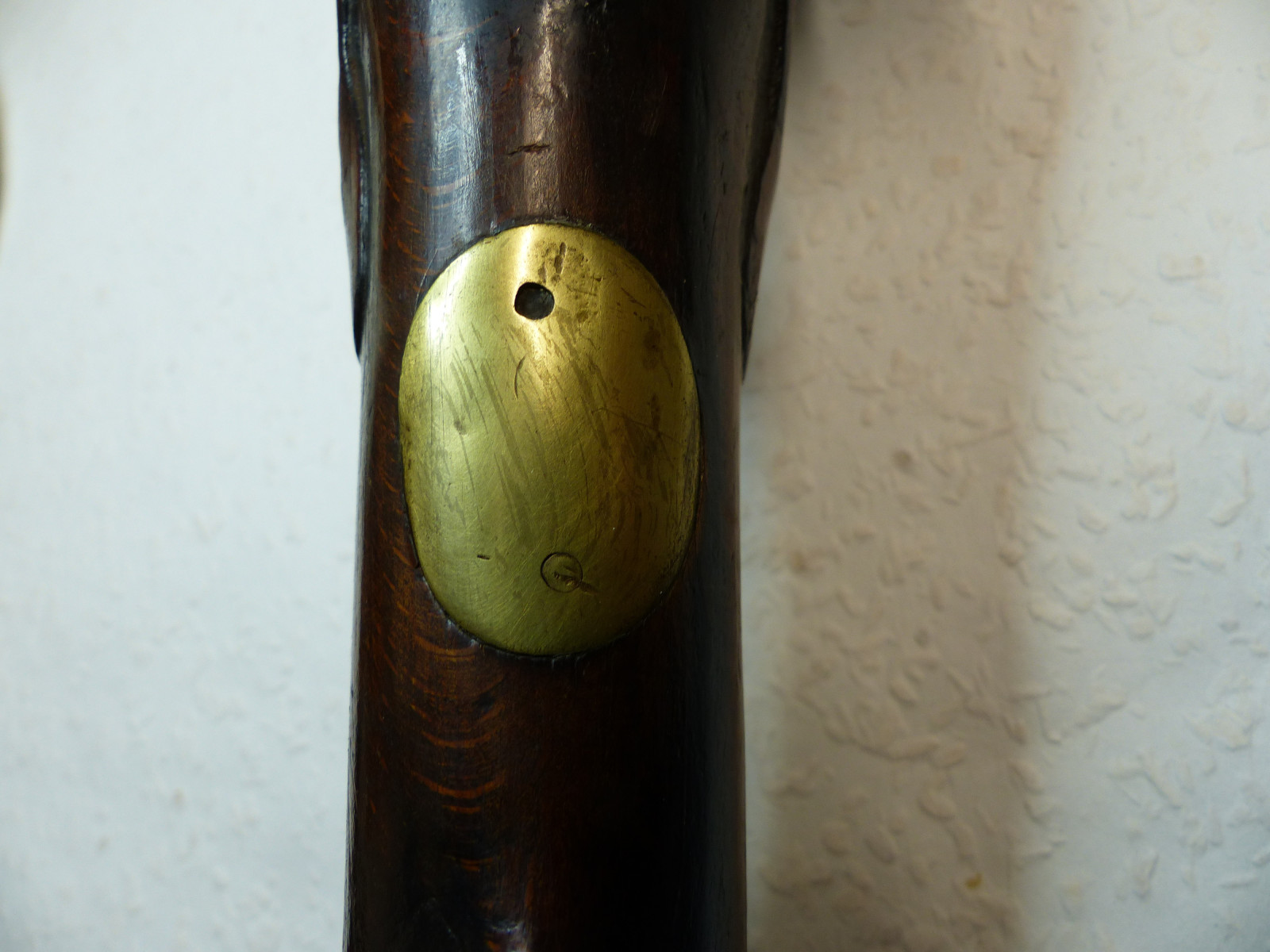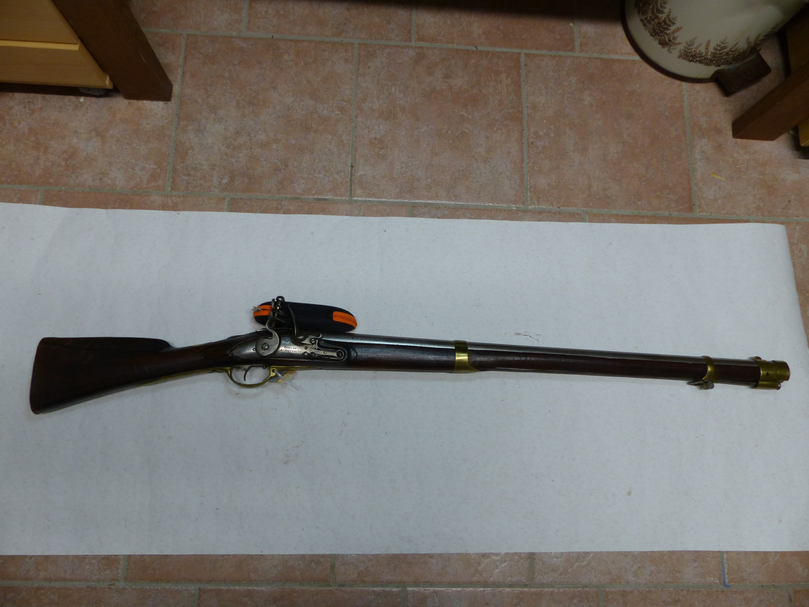 Sie bieten auf ein echtes historisches Gewehr mit Steinschlosszündung. Das Gewehr wurde lt. Aufschrift auf dem Schlossblech vom Büchsenmacher CORBAU-A-MASTRICHT gebaut. Bei meinen Recherchen zu dem Gewehr fand ich nur wenig Informationen, lediglich ein Artikel eines amerikanischen Sammlers beschrieb diese Waffe. Dem zufolge handelt es sich um einen niederländischen Büchsenmacher aus Mastricht (andere Namensschreibweise CORBEAU). Diesem Artikel zufolge wurden entsprechende Gewehre häufig in Amerika verwendet, zu einer Verwendung in Europa fand ich keine Artikel. Auf dem Messingbeschlag unter dem Abzug ist NO 64 eingeprägt, ob es sich um eine Gewehrbezeichnung oder eine militärische Angabe handelt, weiß ich leider nicht. Die Angaben auf der Messingplakette und dem Schulterbeschlag sind leider nicht mehr vernünftig lesbar. Der Hammer ist leicht wackelig auf der Achse, rastet aber in die Sicherheitsrast und die Abschussrast ein und lässt sich auch auslösen. Die Batterie ist funktionsfähig. Der Ladestock ist vorhanden. Es fehlt nur die hintere Befestigung für den Gewehrriemen. Interessant ist die Konstruktion des Schaftholzes, dieses ist leicht nach links abgewinkelt. Das Holz weist altersbedingte Kratzer und leichte Dellen auf, Risse oder ähnlich schlimme Beschädigungen hat das Holz nicht. Das Gewehr hat eine Gesamtlänge von ca. 117cm, der Lauf ist ca. 80cm lang, der Laufinnendurchmesser beträgt ca. 19mm (was das für ein Kaliber ist, weiß ich leider nicht. Die Waffe hat schöne Messingbeschläge und ist meines Erachtens eine Zier für jede Waffensammlung, ich denke, es ist eine in Europa seltene Waffe. Ich muß darauf hinweisen, dass das Gewehr nicht über ein Deutsches Beschusszeichen verfügt, bei einer Nutzung des Gewehrs übernehme ich keine Verantwortung. Noch ein Hinweis: Ich versende nicht ins Ausland. Ggf. kann die Waffe persönlich abgeholt werden. Als Erwerbsvoraussetzung ist lediglich ein Alter von 18 Jahren - das wird vermutlich nicht mehr lange so sein. Der Versand erfolgt über GLS, das Gewehr wird in einer Holzkiste versendet.