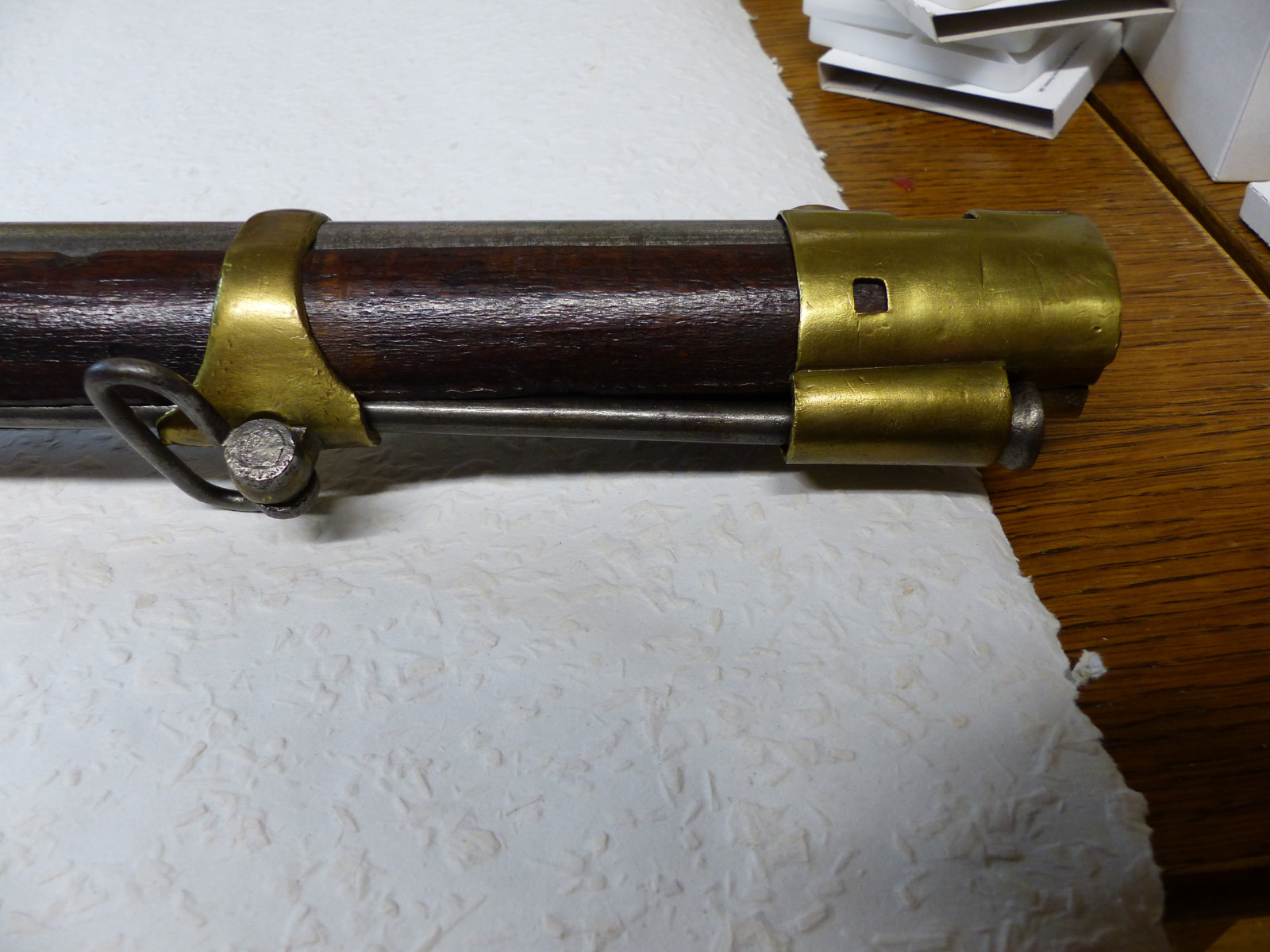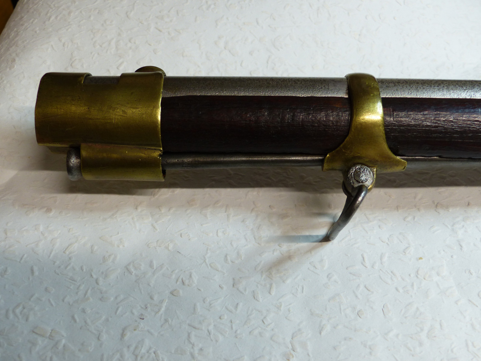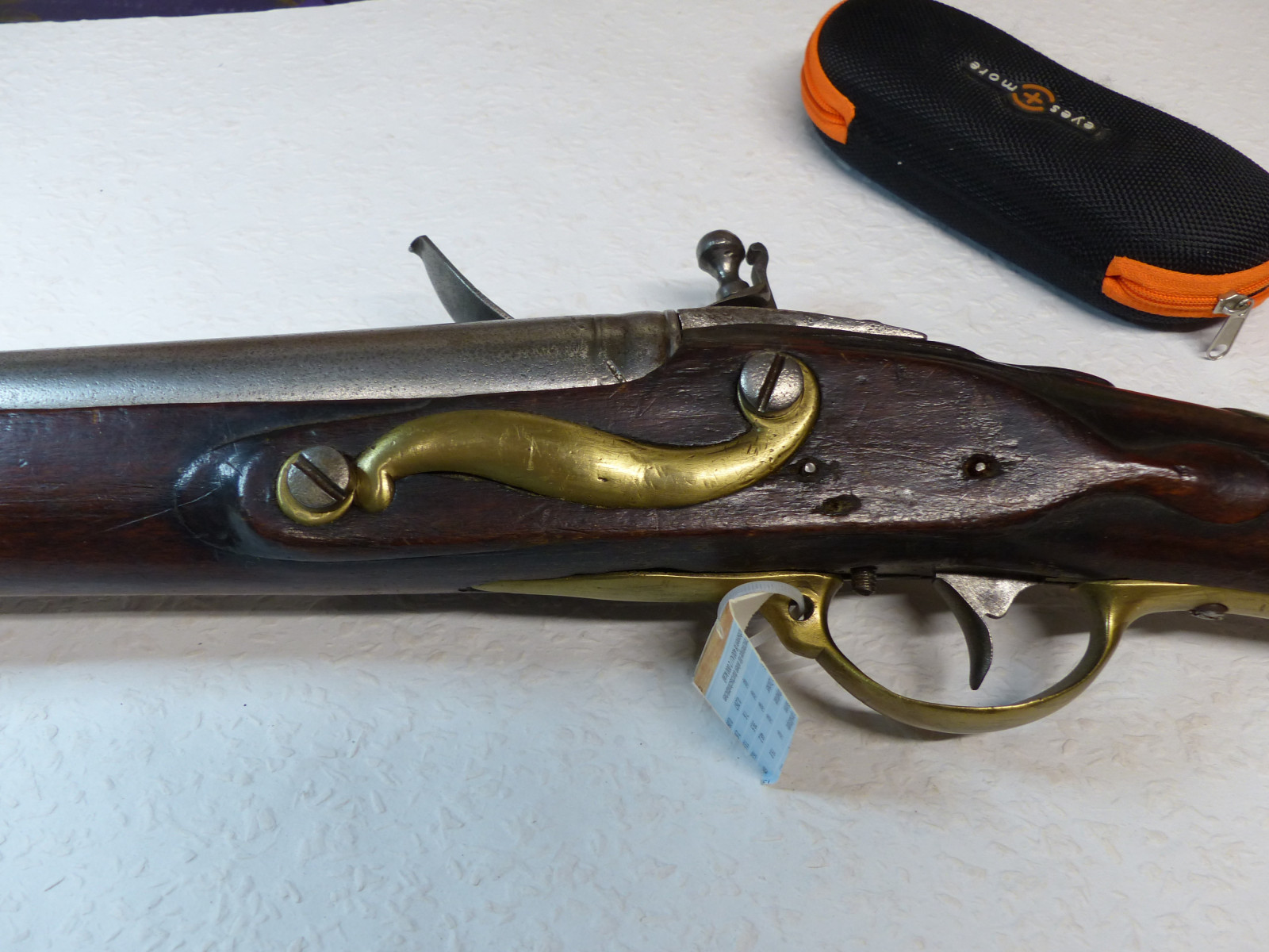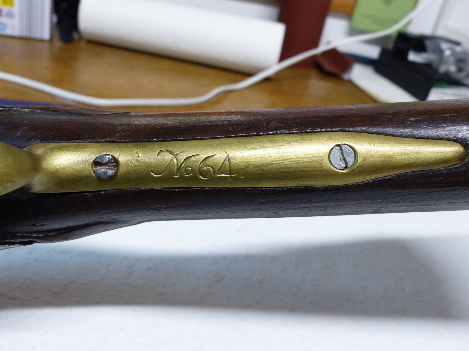 Sie bieten auf ein echtes historisches Gewehr mit Steinschlosszündung. Das Gewehr wurde lt. Aufschrift auf dem Schlossblech vom Büchsenmacher CORBAU-A-MASTRICHT gebaut. Bei meinen Recherchen zu dem Gewehr fand ich nur wenig Informationen, lediglich ein Artikel eines amerikanischen Sammlers beschrieb diese Waffe. Dem zufolge handelt es sich um einen niederländischen Büchsenmacher aus Mastricht (andere Namensschreibweise CORBEAU). Diesem Artikel zufolge wurden entsprechende Gewehre häufig in Amerika verwendet, zu einer Verwendung in Europa fand ich keine Artikel. Auf dem Messingbeschlag unter dem Abzug ist NO 64 eingeprägt, ob es sich um eine Gewehrbezeichnung oder eine militärische Angabe handelt, weiß ich leider nicht. Die Angaben auf der Messingplakette und dem Schulterbeschlag sind leider nicht mehr vernünftig lesbar. Der Hammer ist leicht wackelig auf der Achse, rastet aber in die Sicherheitsrast und die Abschussrast ein und lässt sich auch auslösen. Die Batterie ist funktionsfähig. Der Ladestock ist vorhanden. Es fehlt nur die hintere Befestigung für den Gewehrriemen. Interessant ist die Konstruktion des Schaftholzes, dieses ist leicht nach links abgewinkelt. Das Holz weist altersbedingte Kratzer und leichte Dellen auf, Risse oder ähnlich schlimme Beschädigungen hat das Holz nicht. Das Gewehr hat eine Gesamtlänge von ca. 117cm, der Lauf ist ca. 80cm lang, der Laufinnendurchmesser beträgt ca. 19mm (was das für ein Kaliber ist, weiß ich leider nicht. Die Waffe hat schöne Messingbeschläge und ist meines Erachtens eine Zier für jede Waffensammlung, ich denke, es ist eine in Europa seltene Waffe. Ich muß darauf hinweisen, dass das Gewehr nicht über ein Deutsches Beschusszeichen verfügt, bei einer Nutzung des Gewehrs übernehme ich keine Verantwortung. Noch ein Hinweis: Ich versende nicht ins Ausland. Ggf. kann die Waffe persönlich abgeholt werden. Als Erwerbsvoraussetzung ist lediglich ein Alter von 18 Jahren - das wird vermutlich nicht mehr lange so sein. Der Versand erfolgt über GLS, das Gewehr wird in einer Holzkiste versendet.