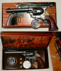 schwere Replika des Colt Army SA 1871, spanische Fertigung, in Originalgröße und Gewicht des echten Revolvers, unbenutzt und in original Verpackung und mit 6 Dummypatronen, die mit Spielzeug-Zündkapseln geladen werden können. Die Waffe ist neuwertig, der Karton außen mit Lagerspuren