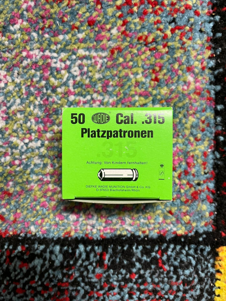 Zum Verkauf steht eine Packung 315 K Platzpatronen der Marke Wadie für Schreckschuss Waffen.