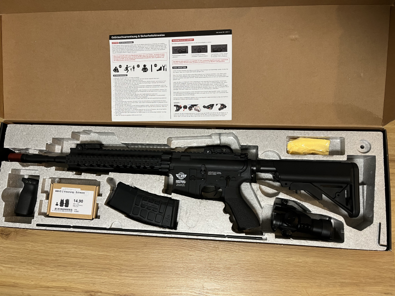 ich verkaufe hier meine Softair CM16 R8-L 0,5JL von G&G. Ich selber habe sie vor Jahren gekauft und nicht einmal draußen benutzt. Daher der Zustand neuwertig. Sie funktioniert auch noch einbandfrei. Der Akku ist nicht mit dabei, da er auch nach dieser langer Zeit natürlich nicht mehr geht. Hier ist es auch besser dann einen neuen zu kaufen, diese sind aber relativ günstig. Für den Funktionstest habe ich mir einen Akku eines Freundes ausgeliehen. Da ich auch ehrlich gesagt keine Ahnung habe, wie viel dass Ding wert ist und auch die Zeit nicht dazu habe hier zu recherchieren, möchte ich einfach nur dass es nicht in der Ecke steht und verstaubt. Die Softair wurde immer an einen trockenen Ort gelagert, weit weg von Feuchtigkeit und sonstigen schädlichen Einwirkungen.