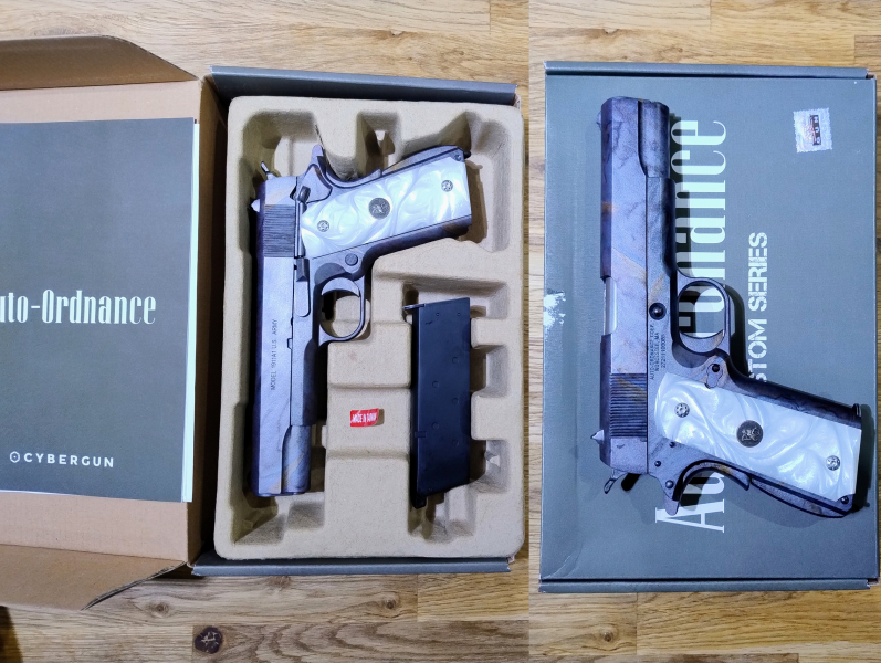 Verkaufe hier eine "gebrauchte" (1A Zustand - unbenutztes Sammlerstück) Cybergun / AWC Auto-Ordnance 1911 Vollmetall GBB 6mm BB Marple Pattern in OVP inkl. Pachmayr "Elfenbein""- Optik Kunstharzgriffschalen - die originalen Griffschalen sind leider nicht mehr vorhanden - Lieferumfang wie auf Foto. Technische Daten: Kaliber: 6 mm BB - Magazinkapazität: ca. 15 Schuss Gas-Magazin - Energie: ca. 1,0 Joule - Länge: 215 mm - Gewicht: ca. 900 g - Standartversand mit DHL ohne Tracking usw. - Bezahlung mit Banküberweisung oder mit PayPal FREUND. Altersnachweis erforderlich! Information für den Käufer - muss laut Gesetzgeber leider sein: Es handelt sich um einen Privatverkauf. Deshalb schließe ich jede Gewährleistung, Rücknahme und alle Schadensersatzansprüche im Zusammenhang mit dieser Auktion und dem verkauften Artikel aus!