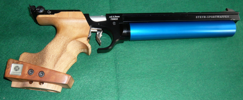 Sie bieten hier auf eine neuwertige Pressluftpistole, Hersteller Steyr, Modell LP 10. Die Pistole wurde kaum geschossen und zeigt daher nahezu keinerlei Gebrauchsspuren, siehe Fotos. Die Waffe wird im Originalkoffer mit dem Originalzubehör ( 1 Ersatzkartusche, 1 Ersatzdichtung, Bedienungsanleitung, 4 Zusatz-Laufgewichte, 1 Schraubendreher und 2 Inbusschlüssel mit Griff sowie 3 weitere kleine Inbussschlüssel, 1 Fülladapter für die Pressluftkartuschen, 1 Dose mit Restmunition sowie eine selbstgefertigte Aluplatte zum Anschrauben an den Griff zum Aufgelegtschießen). Der verstellbare Morini-Griff hat die Größe "M". Die Pressluftkartuschen sind beide abgelaufen, funktonieren jedoch noch beide.