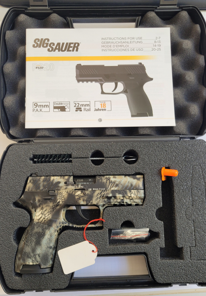 Zum Angebot steht eine Schreckschusspistole Sig Sauer Mod. P320 Cobra im Camouflage Design. Das Magazin hat eine Kapazität von 14 Patronen. Die Pistole kommt mit allem im Lieferumfang üblichen Zubehör (siehe Bild). Von Sig Sauer werden in Deutschland derzeit keine Schreckschusswaffen mehr angeboten.