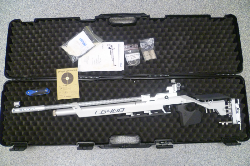 Zubehör: Werkzeug, Laufgewichte, Bedienungsanleitung, Schußbild, Reinigungszeug und Originalkoffer