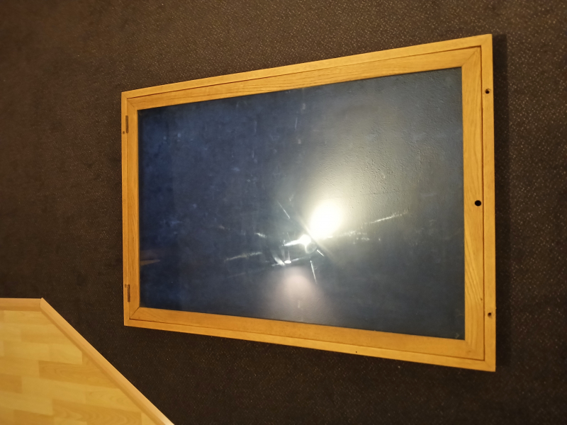 Schaukasten/Vitrine mit Glasdeckel aus massivem Hartholz. Gewicht: 16kg, Länge: 102 cm, Breite: 71 cm, Tiefe: 5 cm.