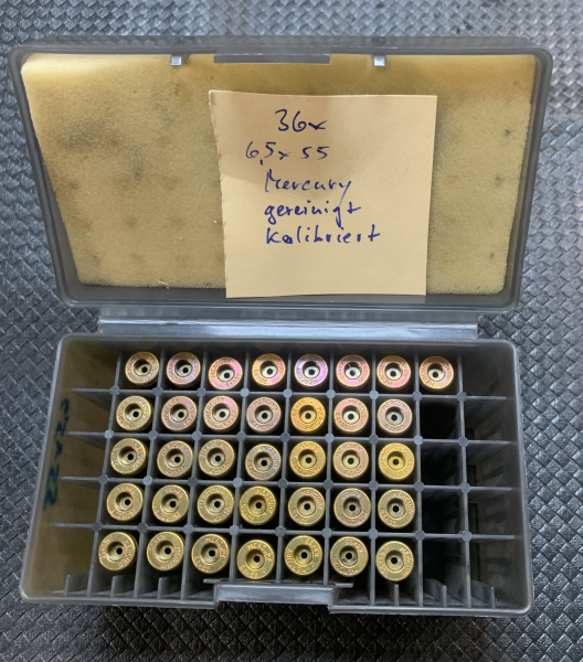 Patronenbox mit Hülsen 6,5 x 55. S.Foto