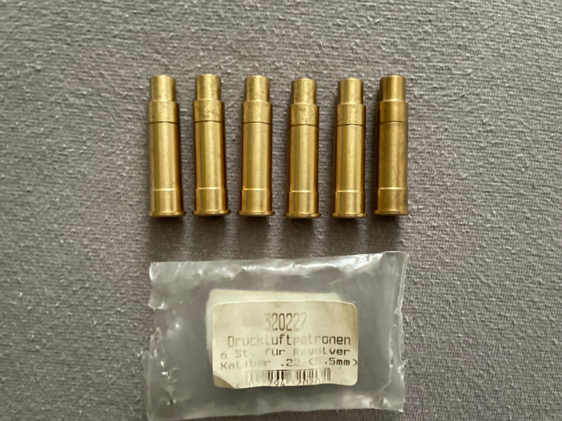 Sechs neue unbenutzte Druckluftpatronen für LEP Revolver aus Messing Kaliber .22 (5,5 mm). Länge ca. 39 mm.Privatverkauf ohne Garantie und Rücknahme.