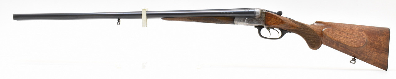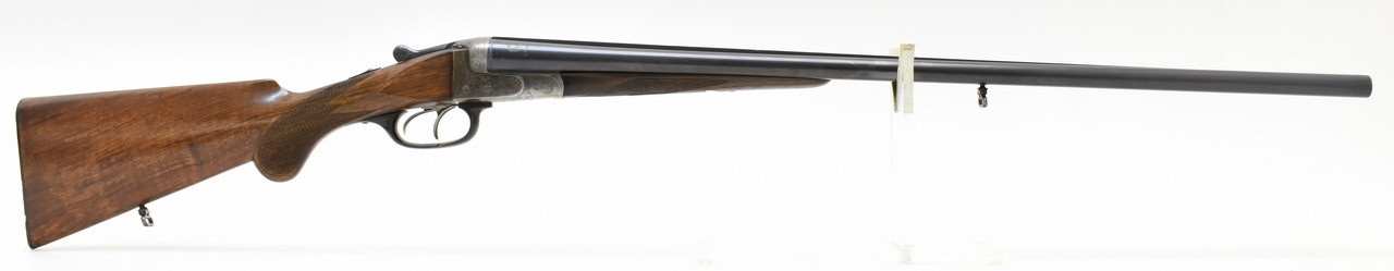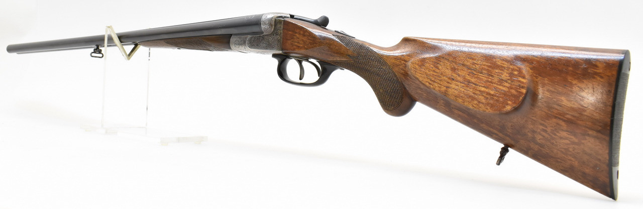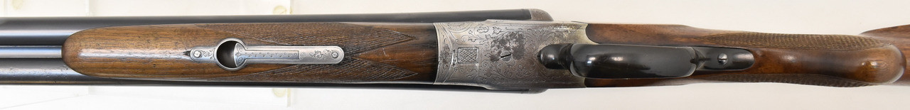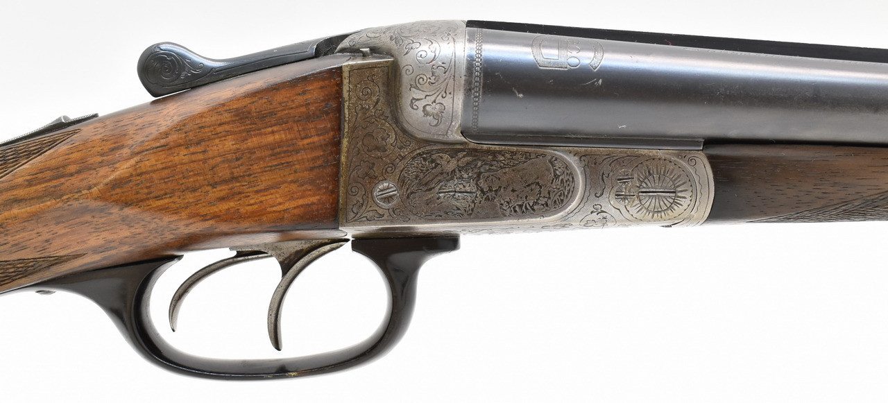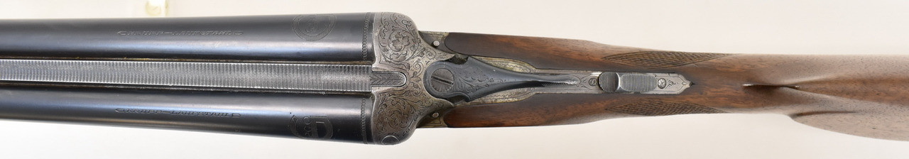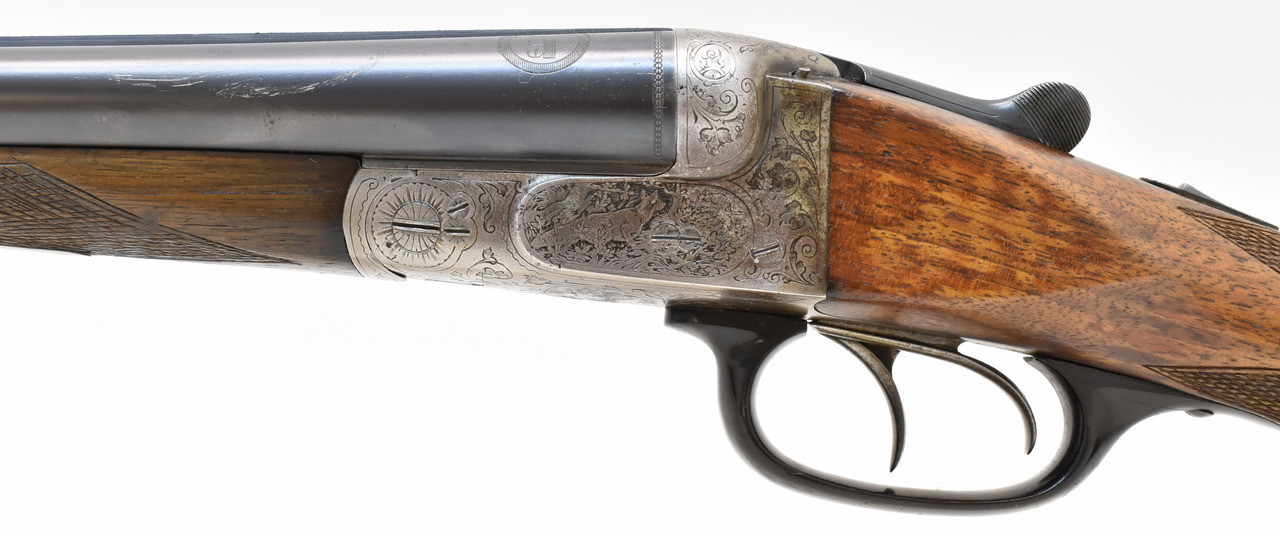 Querflinte mit Doppelabzug ohne Ejektor, die Läufe sind matt mit Schussriefen.