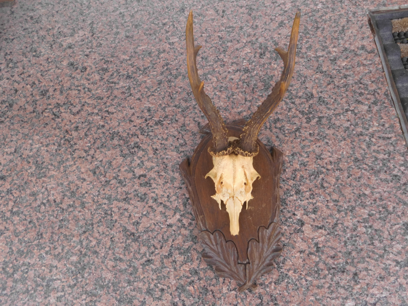 Biete 1 sehr kapitales Rehgehörn auf historischem Schild montiert(alter unbekannt-sehr gut erhalten!