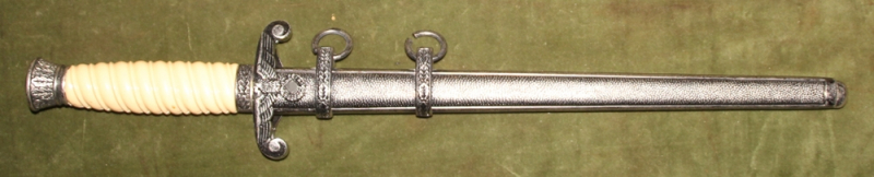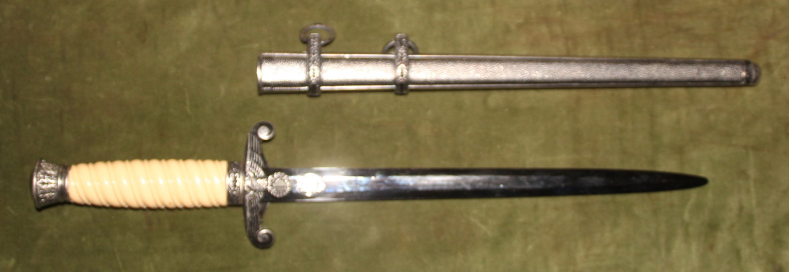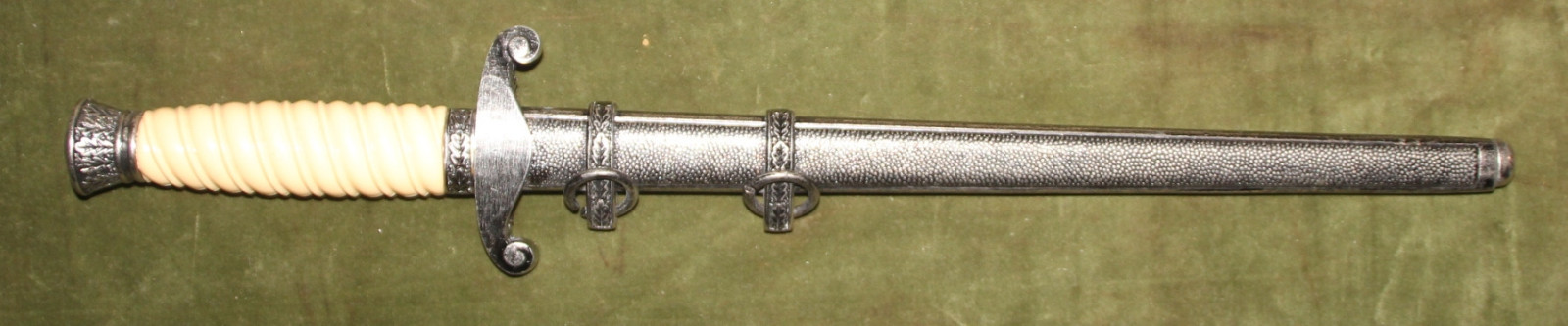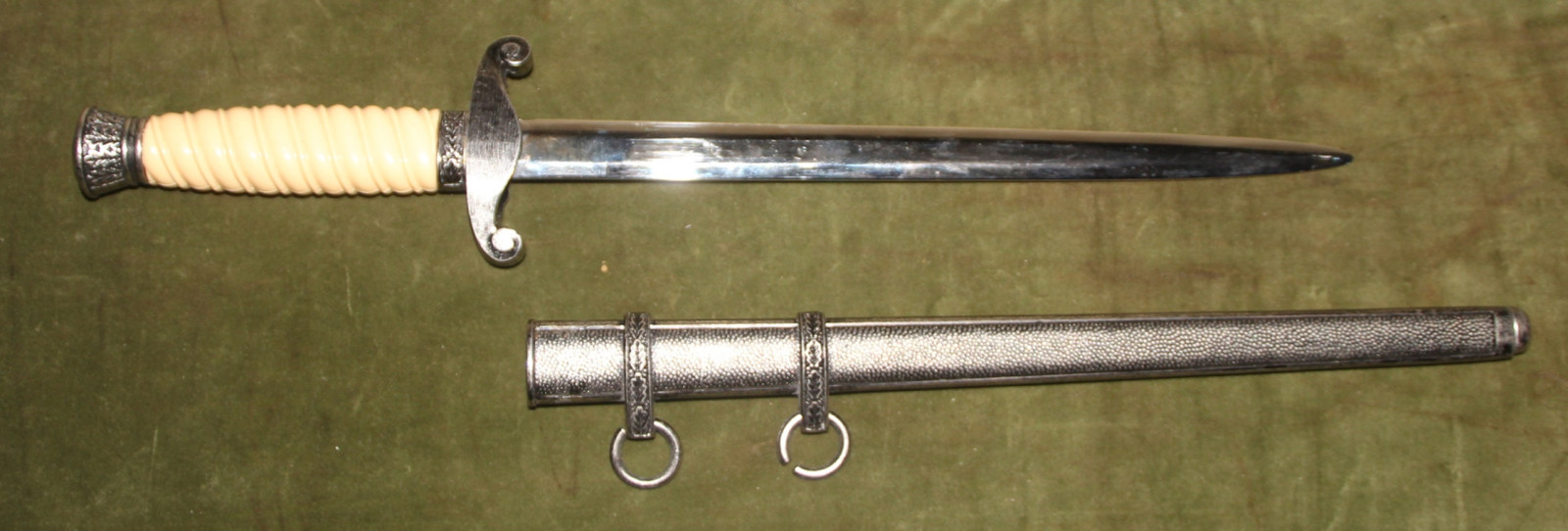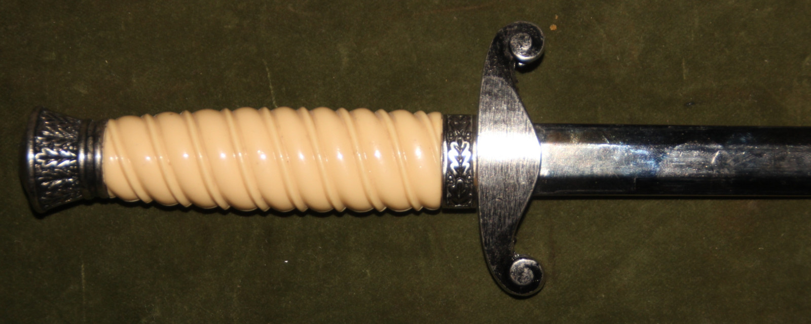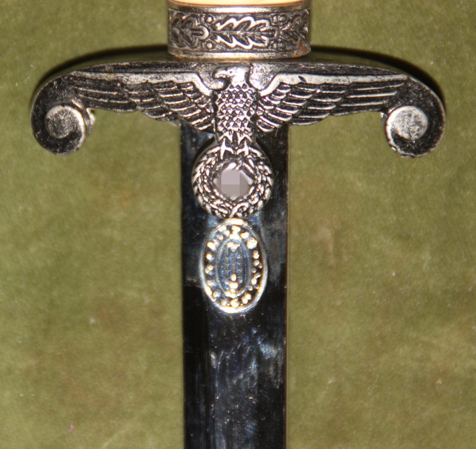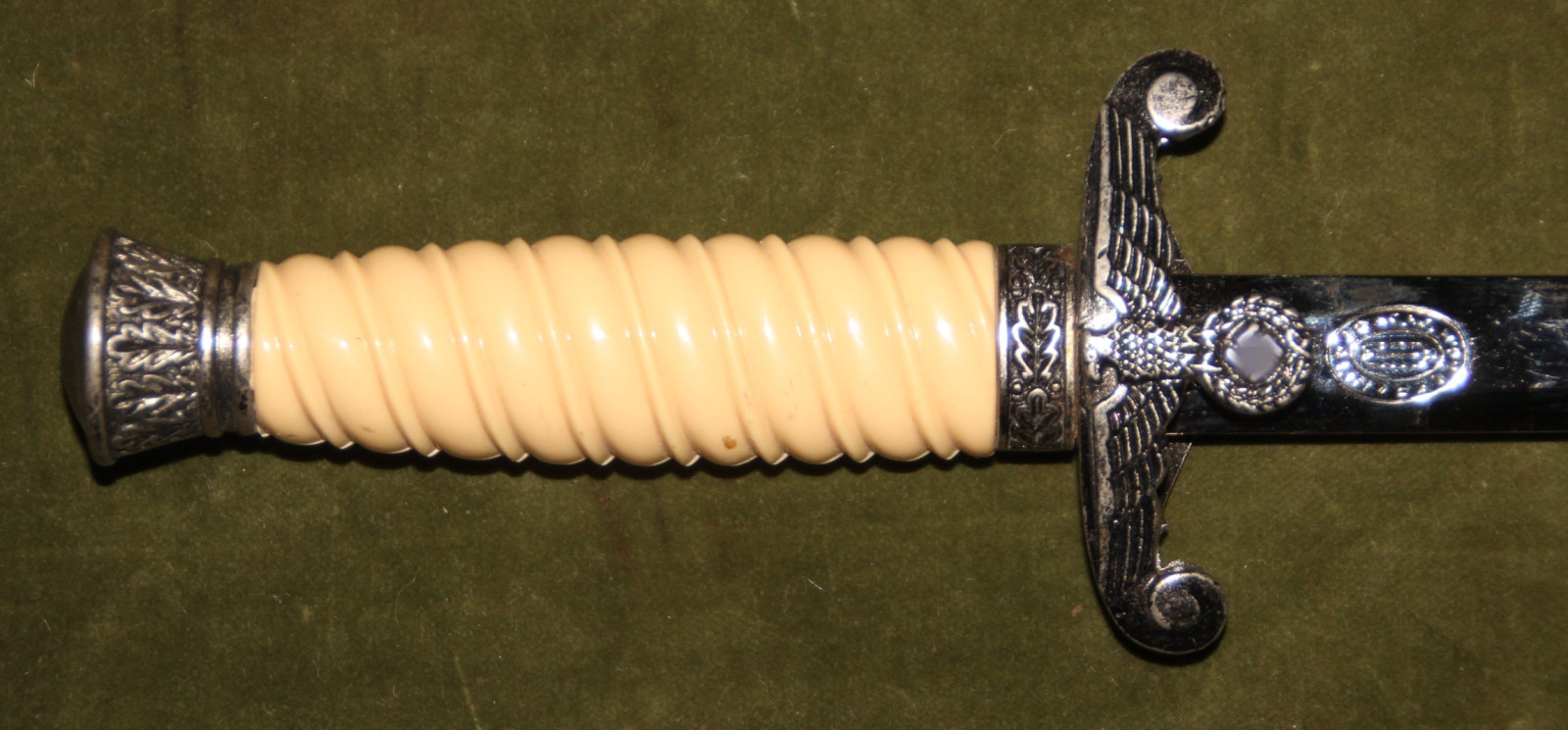 Heeresoffizierdolch der deutschen Wehrmacht, mit Scheide, wohl spanische Kopie aus den 1960er oder 1970er Jahren, die Klinge mit einer nahezu unleserlichen Nachahmung der Herstellermarke Höller, Solingen (Thermometermarke) Für Reenactors oder als Deko. Siehe Fotos. Die Fotos sind Bestandteil der Beschreibung. . Alle Angaben nach bestem Wissen und Gewissen. Dies ist ein Privatverkauf. Gemäß EU-Recht unter Ausschluss von Gewährleistung und jeglicher Sachmängelhaftung. Der Käufer ist selbst verantwortlich für die Einhaltung der gesetzlichen Vorschriften / des Waffenrechtes seines Landes. Fragen bitte rechtzeitig vor dem Auktionsende stellen. Ich beobachte meine Auktionen und mein Mail-Postfach nicht permanent. Daher bei kurz vor Auktionsende gestellten Fragen keine Garantie auf eine rechtzeitige Antwort. Verkauf nur gegen Vorkasse. Banküberweisung oder PayPal (Bei Zahlung über PayPal erhöht sich der Kaufpreis um die von PayPal einbehaltene Gebühr, bei Zahlung mit der Option Geld an Freunde senden entfallen diese zusätzlichen Kosten) Bei Selbstabholung ist Barzahlung möglich. Die Versandkostenpauschale deckt außer den reinen Portokosten auch einen Anteil an Verpackungs und Fahrtkosten zum nächstgelegenen Paketshop. Versandkosten sind nicht verhandelbar. Die Versandkosten sind Kosten für den Inlandsversand. Versandkosten ins Ausland gemäß den aktuellen Preislisten der beauftragten Paketdienste sind höher.
