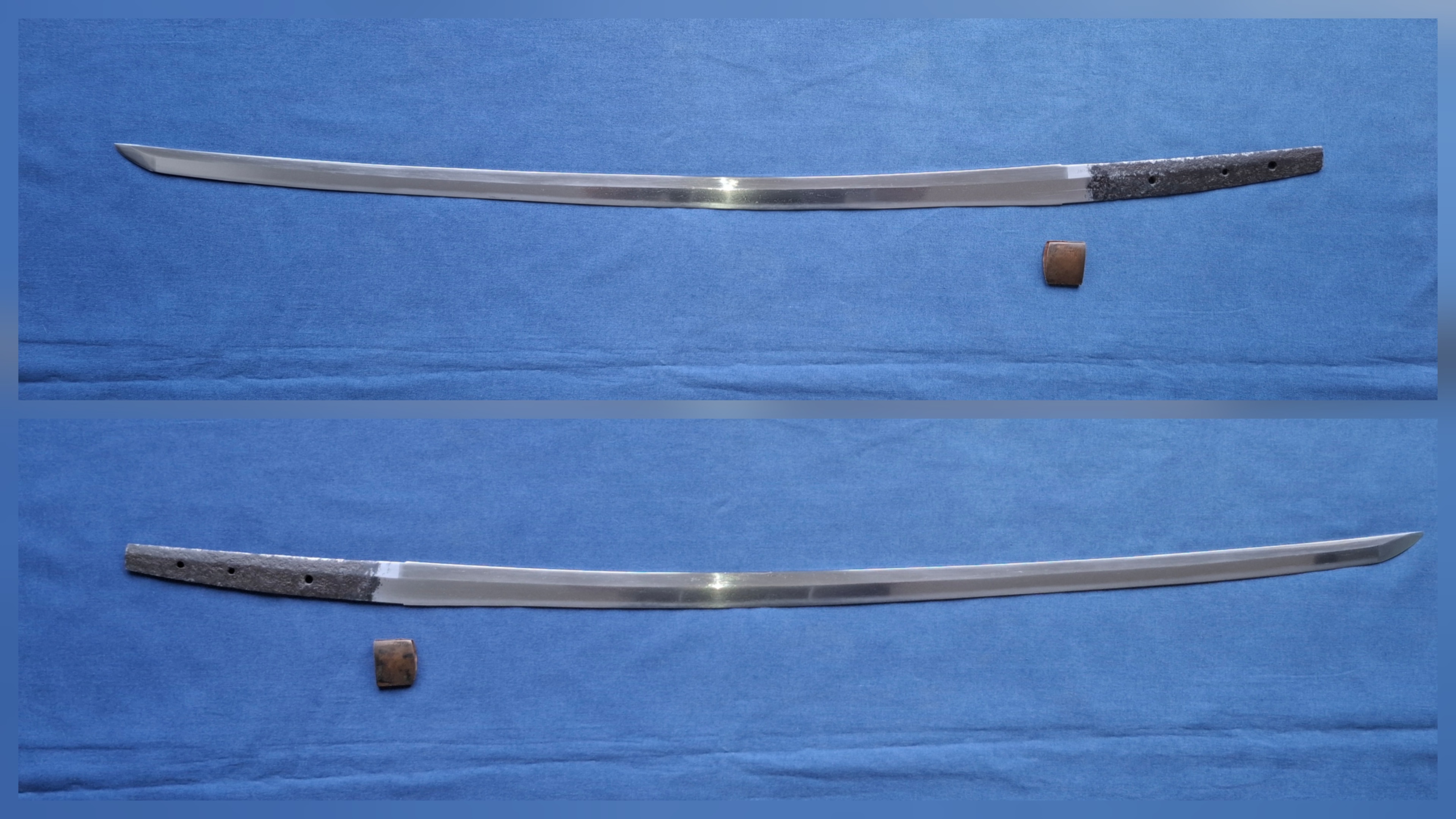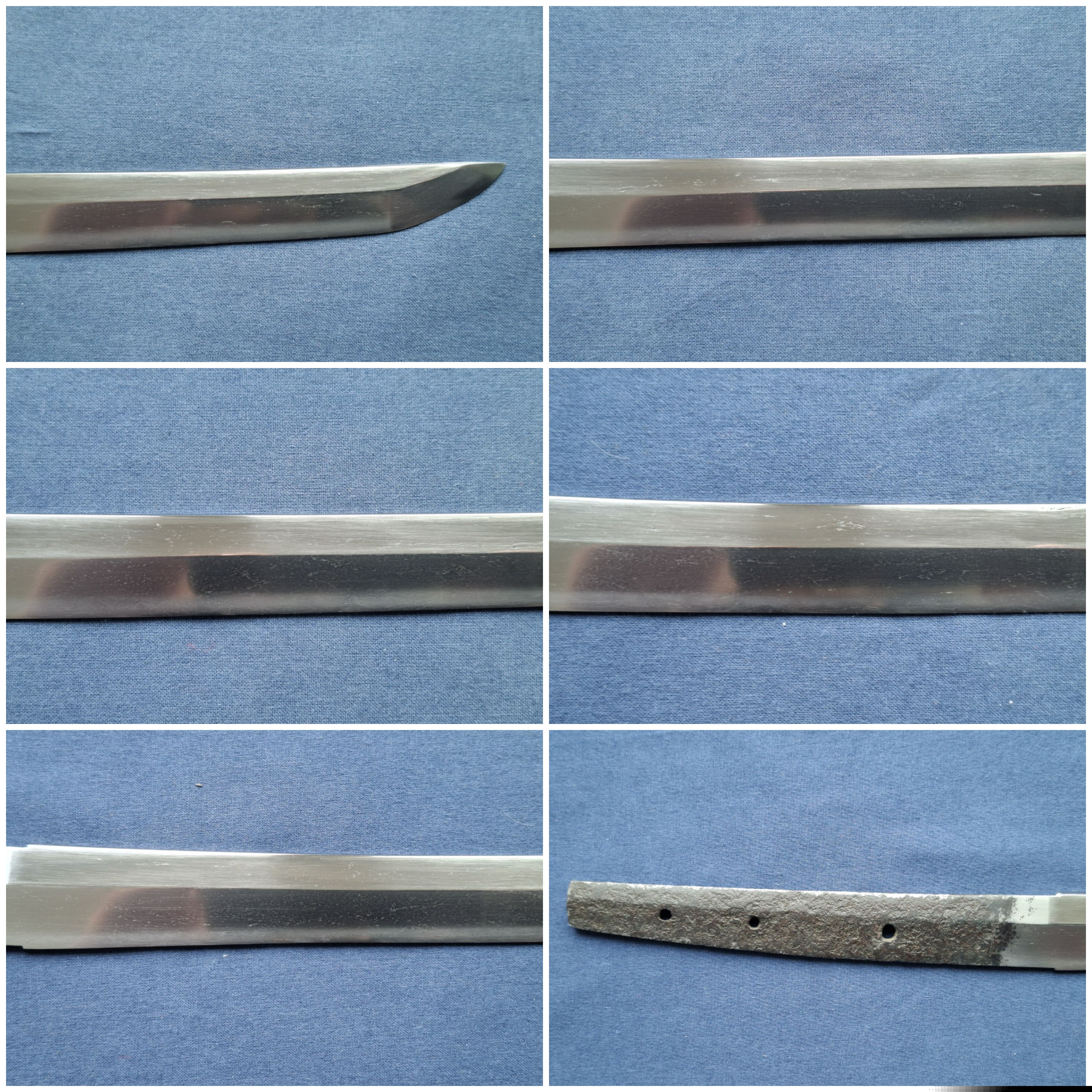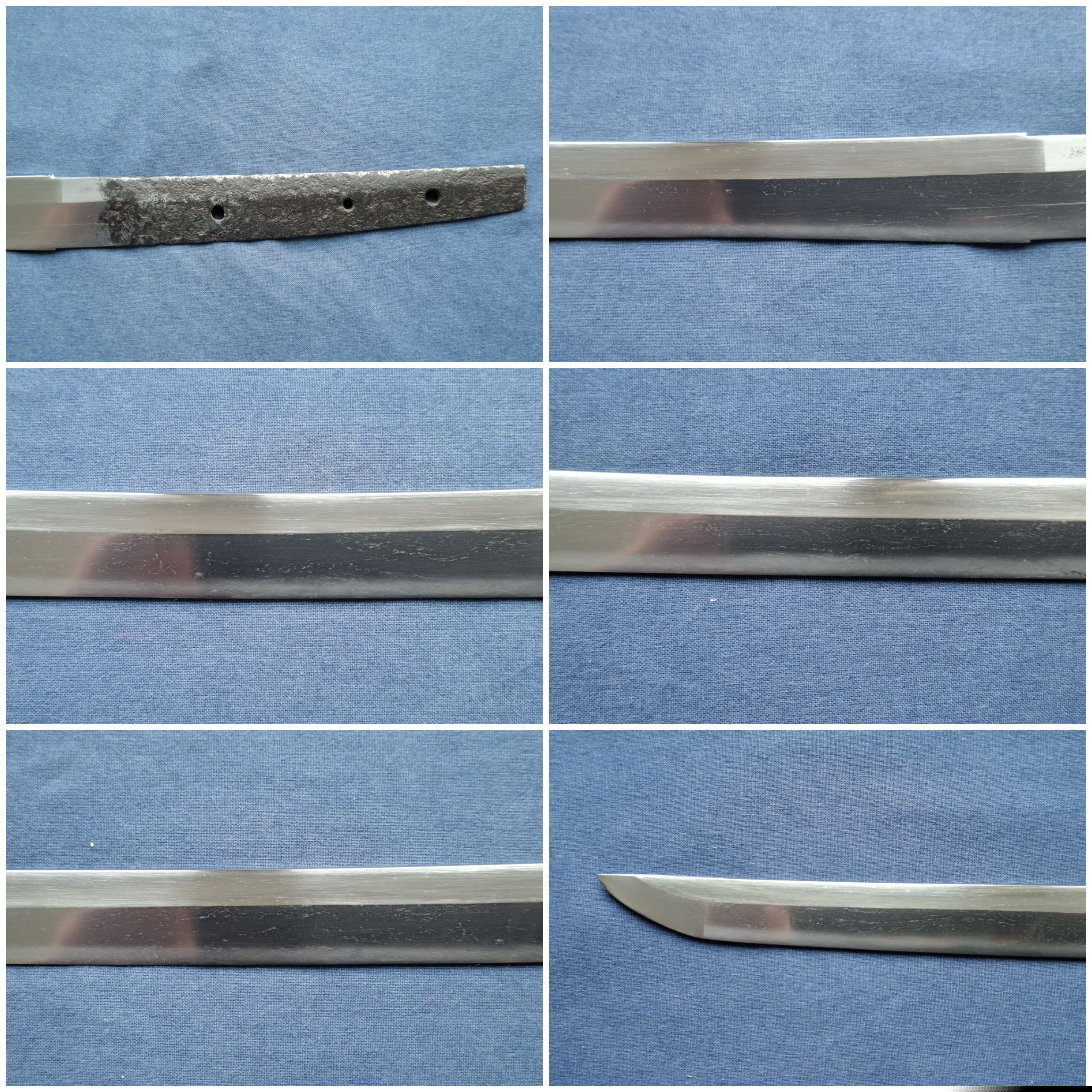 Gesamtlänge Klinge: 88 cm. Nagasa: 69 cm. Motohaba: 3,05 cm. Sakihaba: 1,9 cm. Motogasane: 7,9 mm. Sakigasane: 5,5 mm. Sori: 1,4cm. Gewicht: 680 g. Massive Klinge mit breiter Shinogi. Hamon schon schmal an einigen Stellen.