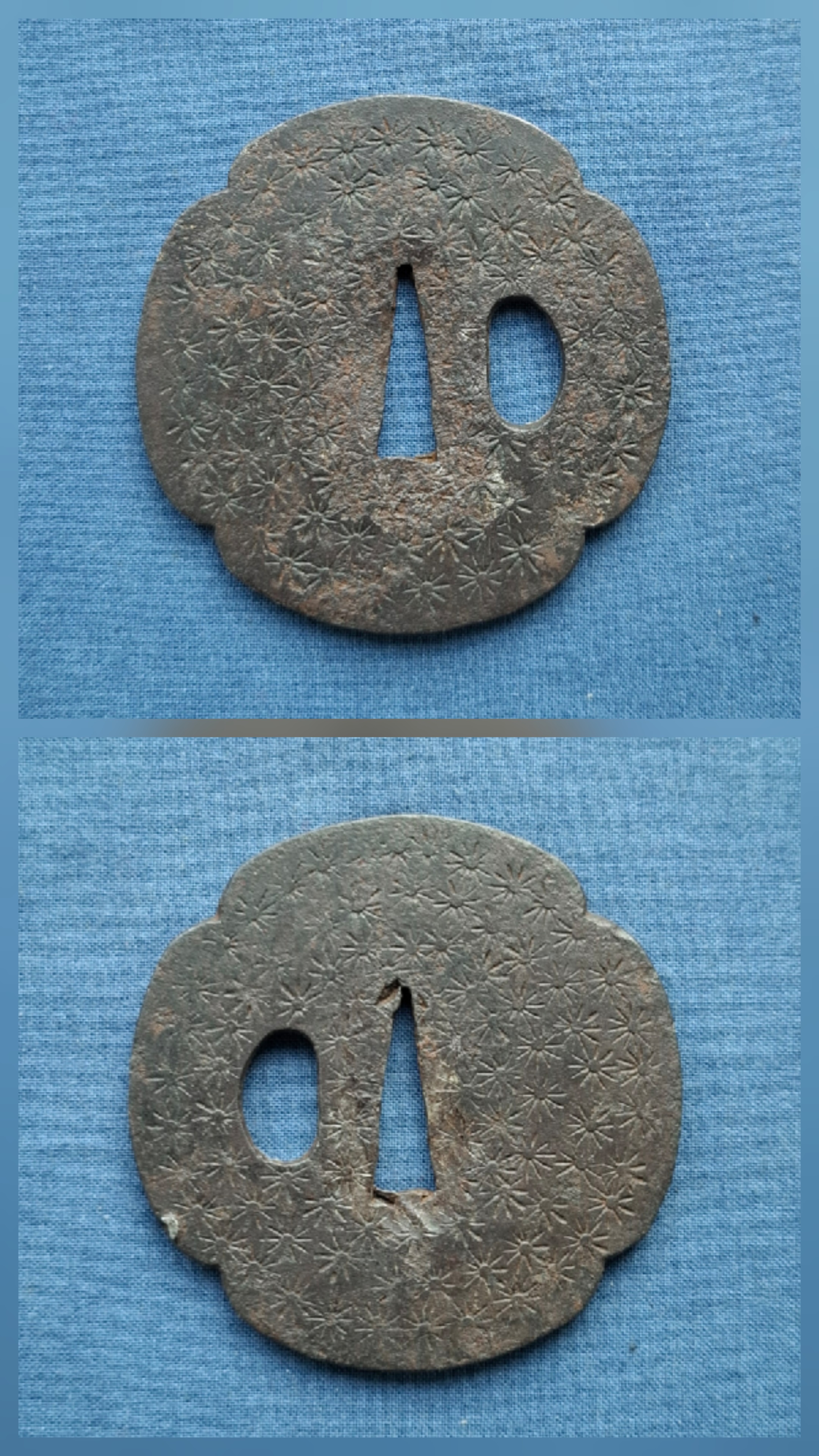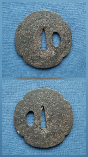 Alte, original antike japanische Tsuba. Eisen, Oberfläche komplett mit geprägten Blüten. Alte Patina.