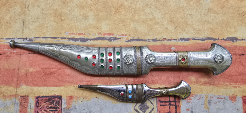 Shibriyas, ein Paar aus Jordanien, wurden von Berberstämmen angefertigt.Diese sind aus Metall, Kupfer, teiw. versilbert, mit kleinen Halbedelsteinen verziert.