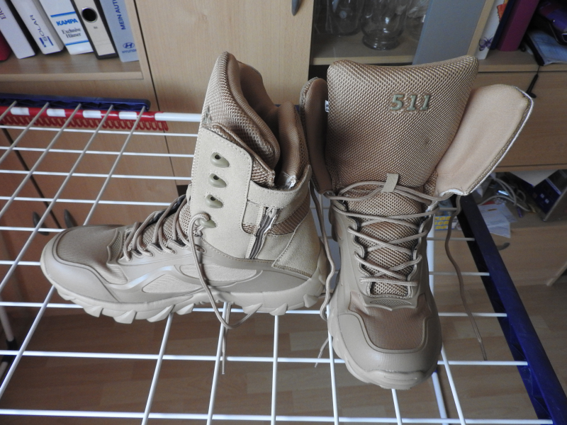 Biete leichte Taktische Einsatzstiefel der Marke 5.11, sandfarben, Größe 44. Material ist PU und atmungsaktives Textilmesh, rutschfeste Profilsohle. Die Stiefel werden durch die Schnürsenkel eingestellt und durch Reißverschlüsse an den Schuhinnenseiten verschlossen. Der Reißverschluss wird am oberen Rand durch eine Lasche gesichert.
