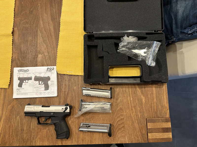 Verkaufe meine Pistole Walther P22 in Nickel mit 3 Magazinen und Orginal Koffer im Kaliber 22 L.R da Platz in KW-Schrank von nöten. Die Pistole ist in einem Guten Zustand.