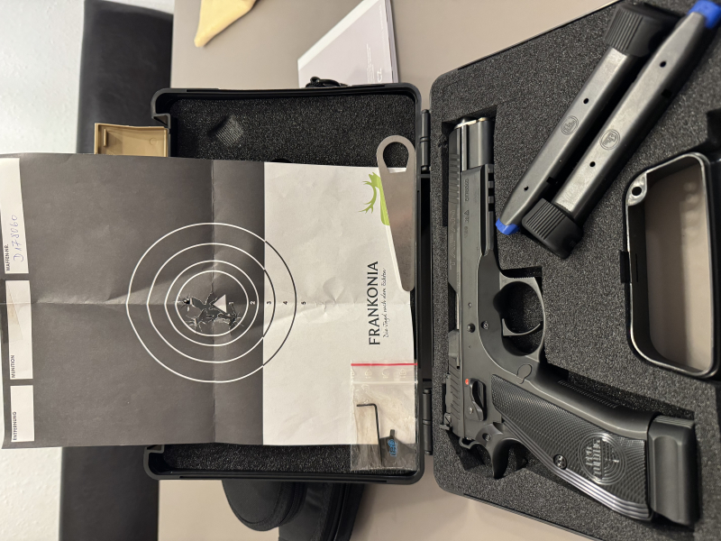 Zu verkaufen meine Cz Taipan Sport 9x19 gekauft neu am 11.04.2023 Rechnung dabei. Die original Holz Griffschalen habe verkauft weil zu groß für meine Hände. Dann habe gekauft die original Scharte Griffschalen und noch ein paar grün in g10. Mit Waffe habe ungefähr 550 Schuss abgefeuert. Waffe in neuwertigen Zustand. Waffe ist in Original Zustand und nicht modifiziert. Verkaufe weil meistens schieße mit kk spopi.