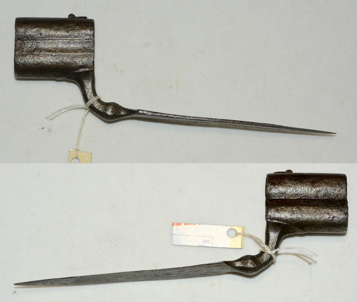 Kleines Tüllenbajonett für doppelläufige Vorderladerwaffe, um 1800, sicher für kleines Kaliber, denn die Innenabstände in der Tülle sind verhältnismäßig gering, Klingenlänge 15,5 cm, für eine Waffe mit ca. 17 mm Laufaußendurchmesser an Mündung und Außenabstand der Läufe vorne 34.5 mm, grob gereinigte Rostoberfläche, keine Markierung, an linker Seite fehlt die Klemmfeder