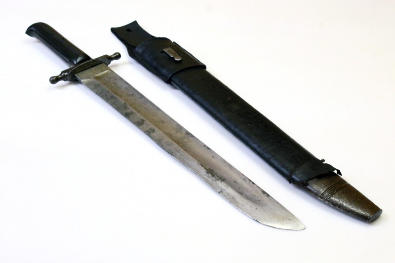 Der Griff mit durchgehenden Erl. Die vierfach vernieteten Griffschalen aus Horn. Der Knauf vogelkopfförmig. Eisernes Parier mit tropfenförmigen Enden. Das Parier quartseitig gestempelt "P.R.1.B." über "2. 23." Der Griff mit Alters- und Tragespuren. Das Parier mit konservierender Patina über Korrosionsansätzen.