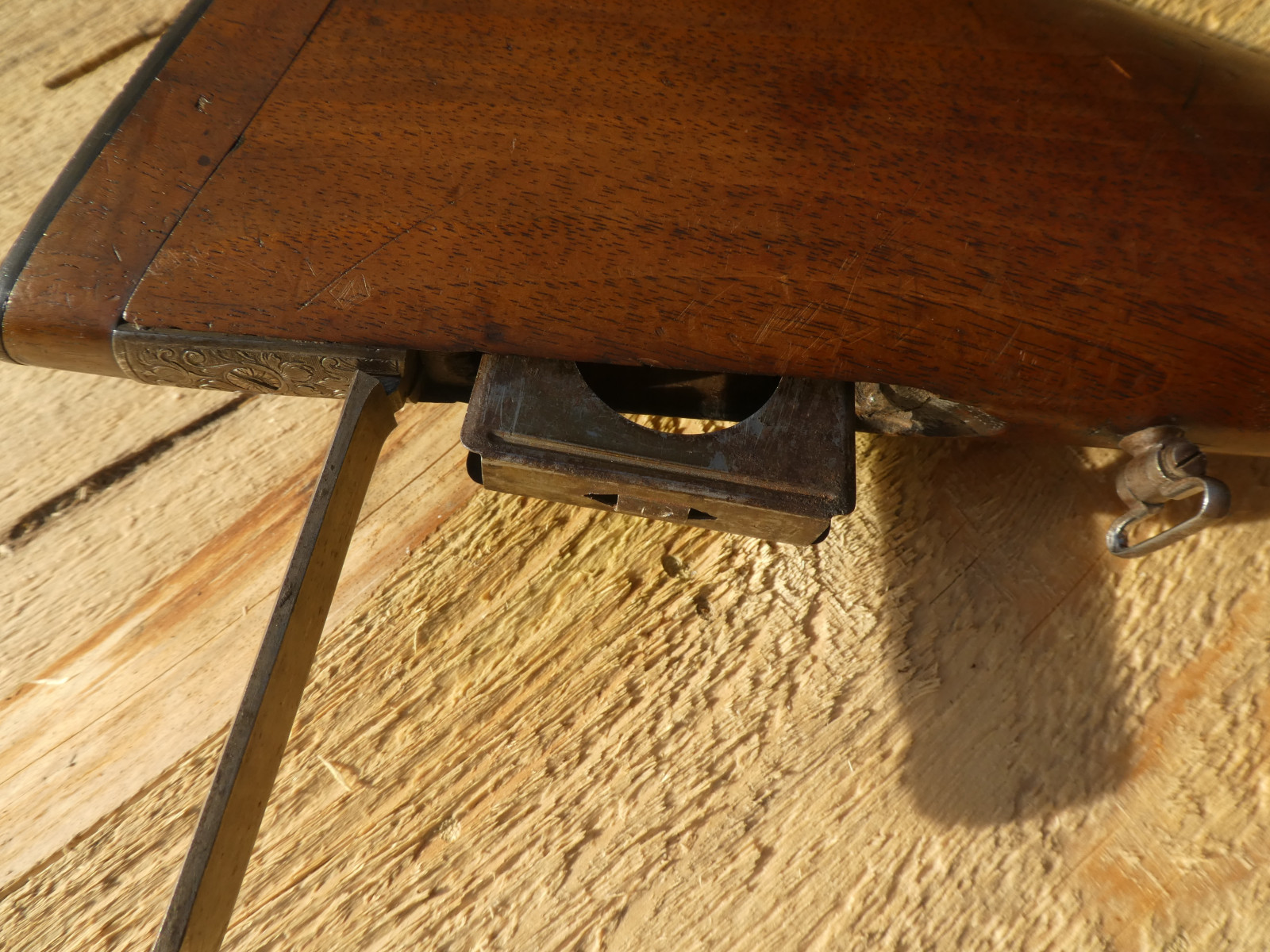 Im Schaft befindet sich ein Fach zur Aufnahme eines gefülltem Ladestreifen, hier aber natürlich nur ein leerer Ladestreifen, der ist auch dabei. Ansonsten braucht die Waffe etwas Liebe und Öl dann wird sie wieder wie neu erstrahlen.