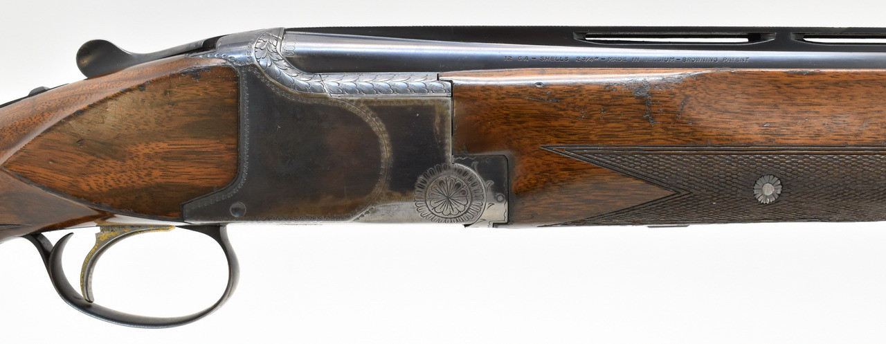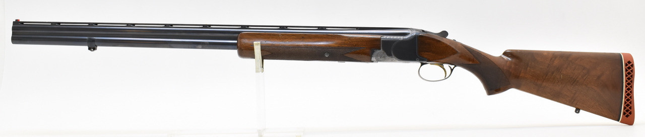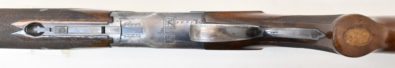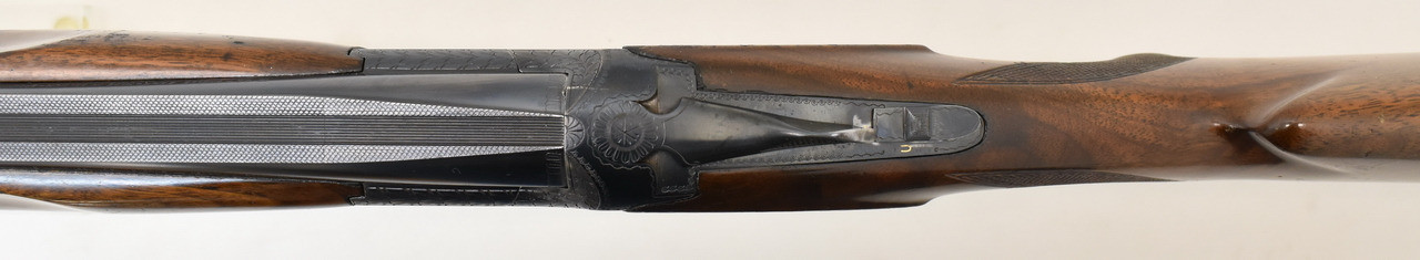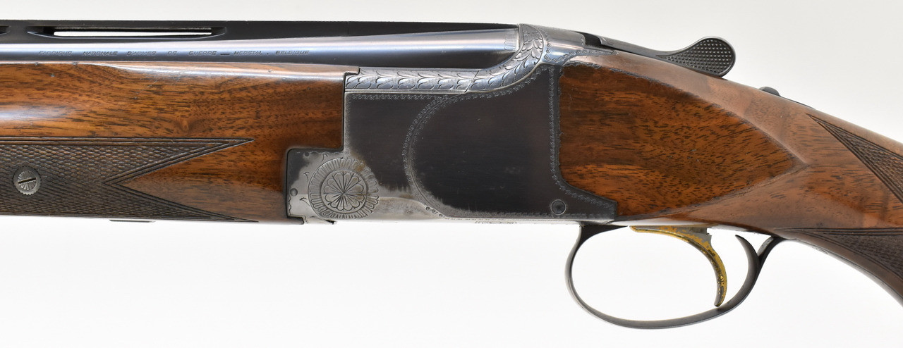 BDF aus Produktion der belgischen FN / Fabrique Nationale, Herstal. Baujahr 1969. Brünierte Stahlbasküle mit dezenter Randgravur und stabiler Laufhakenverriegelung. Selektiver Einabzug, Ejektor, dichter Verschluss. Die Läufe sind leicht matt, die Brünierung stark berieben. 16mm breite und ventilierte Laufschiene mit Hilfskorn. 36cm langer gerader Schaft. ( Schaftlänge gemessen vom Abzug bis Mitte Gummischaftkappe ).