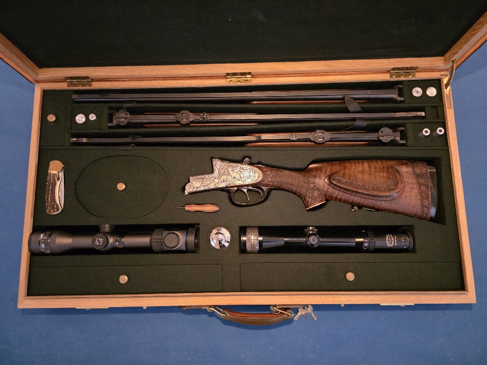 Angeboten wird eine luxuriöse Edelaufführung als Set und Komplettlösung für den jagdlichen Alttag mit lederbezogenen Passformkoffer und viel Zubehör.