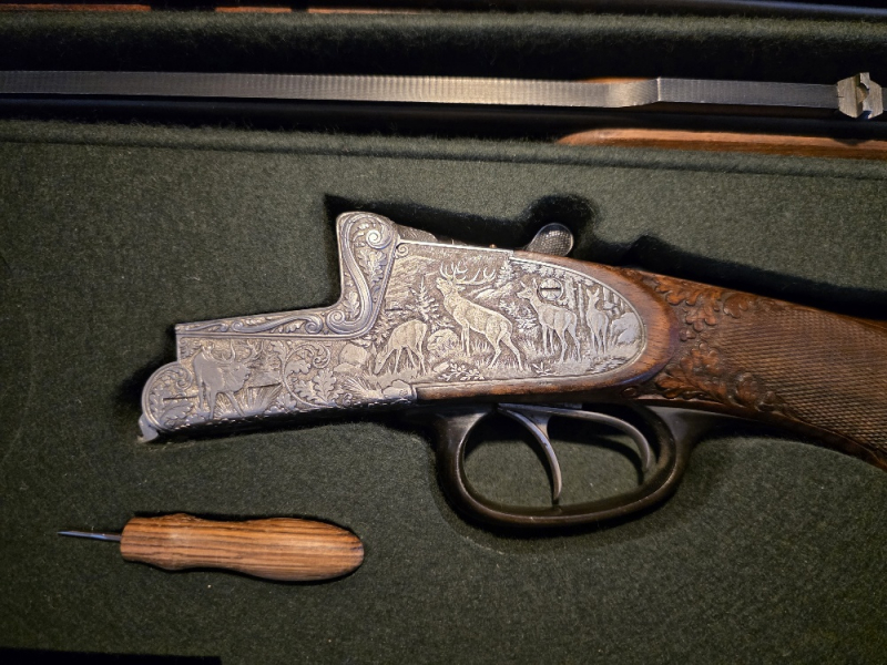 Die Waffe ist aufwendig mit diversen Tier - und Landschaftsmotiven und Eichenlaubeinfassungen graviert (Graveur F. Bösler)