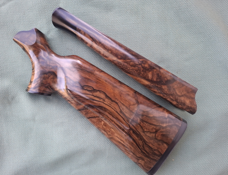 Schaft für Blaser R8 in Holzklasse 9, sehr schönes dunkles Schaftholz, Schaftlänge 370mm, Vorderschaft für normale Läufe, kann aber gegen Aufpreis aufgeweitet werden, Aufpreis für normale Fischhaut €140.'
