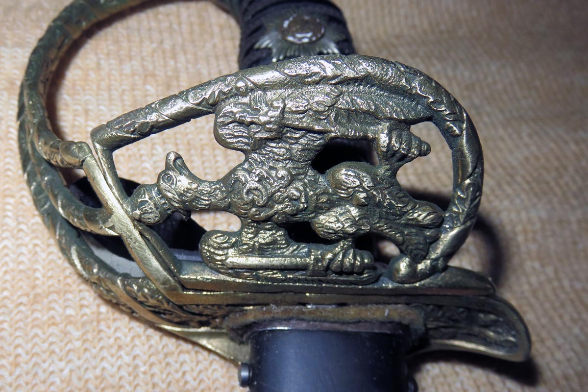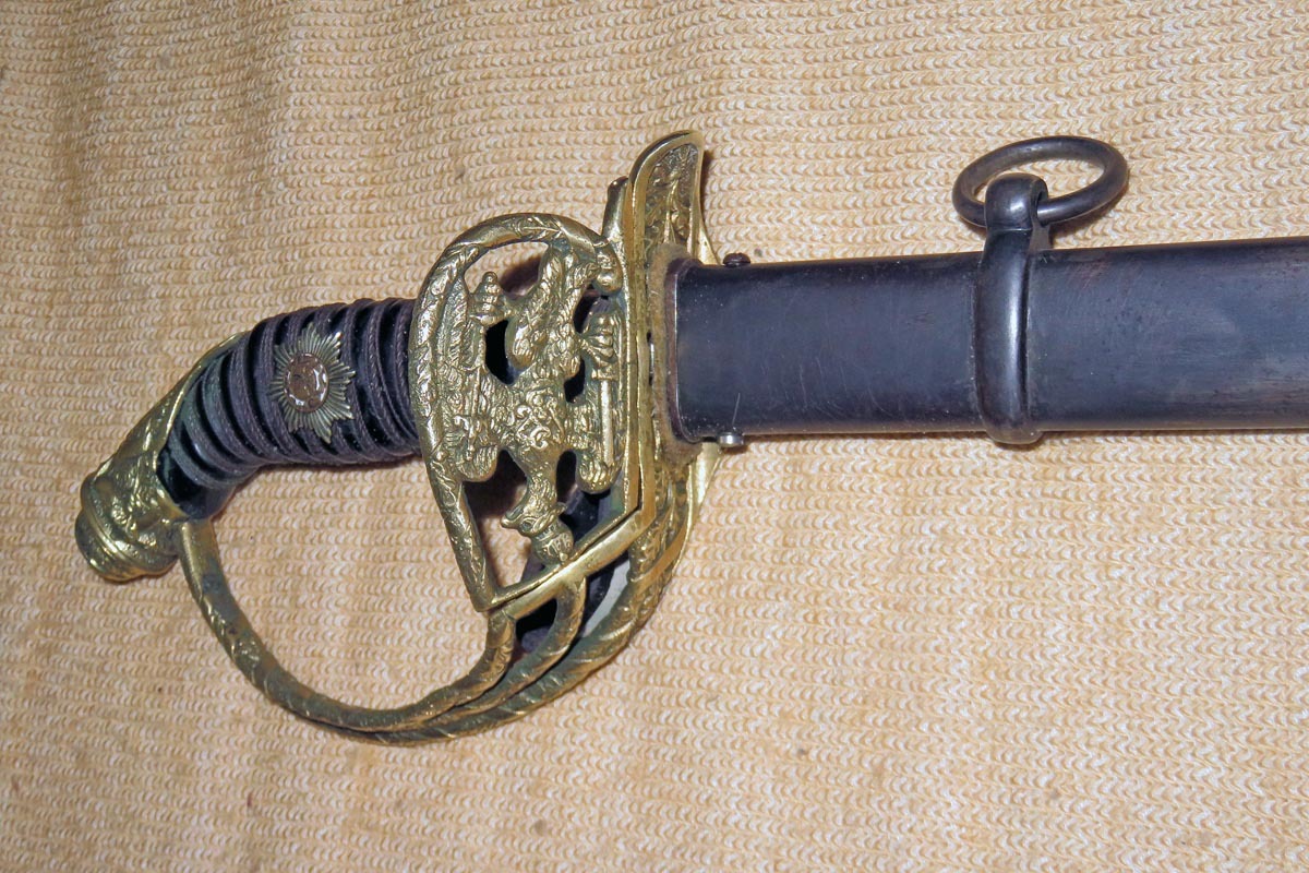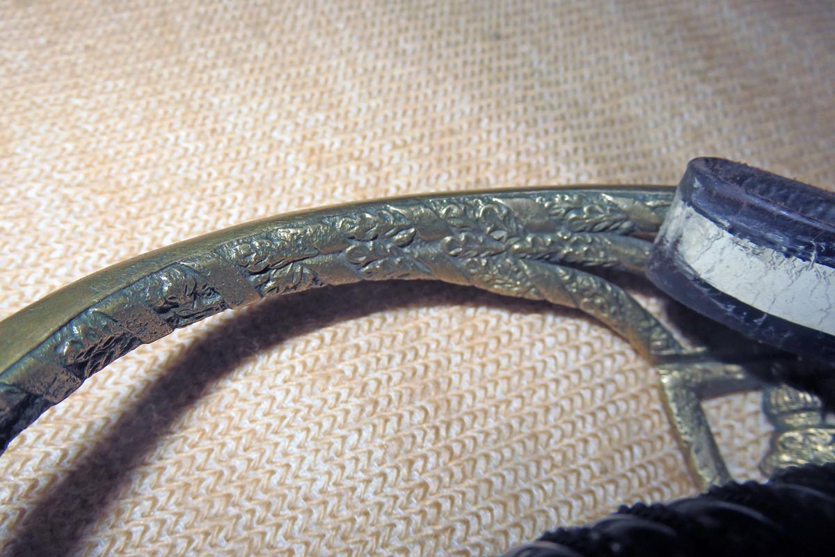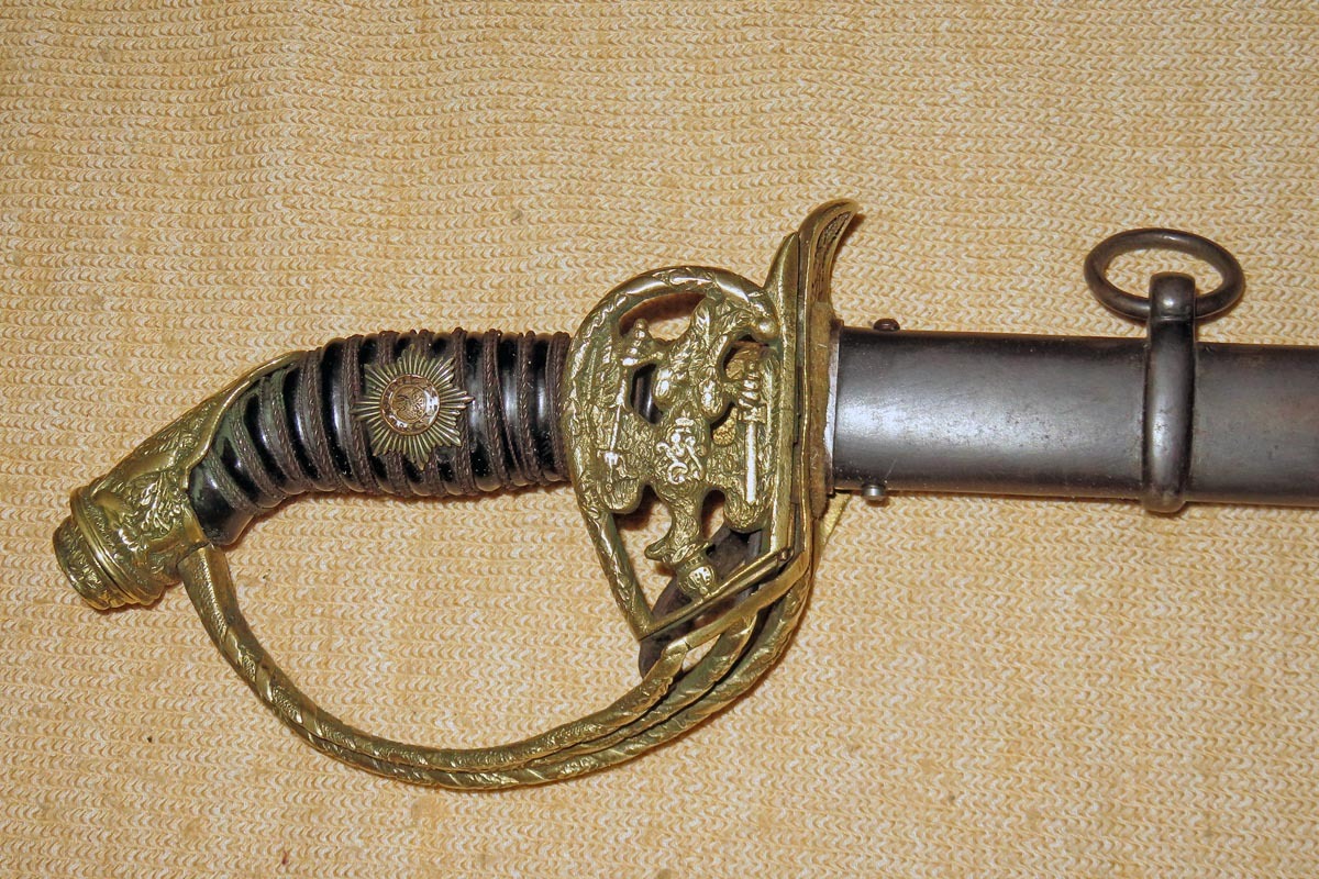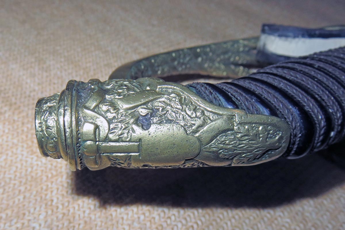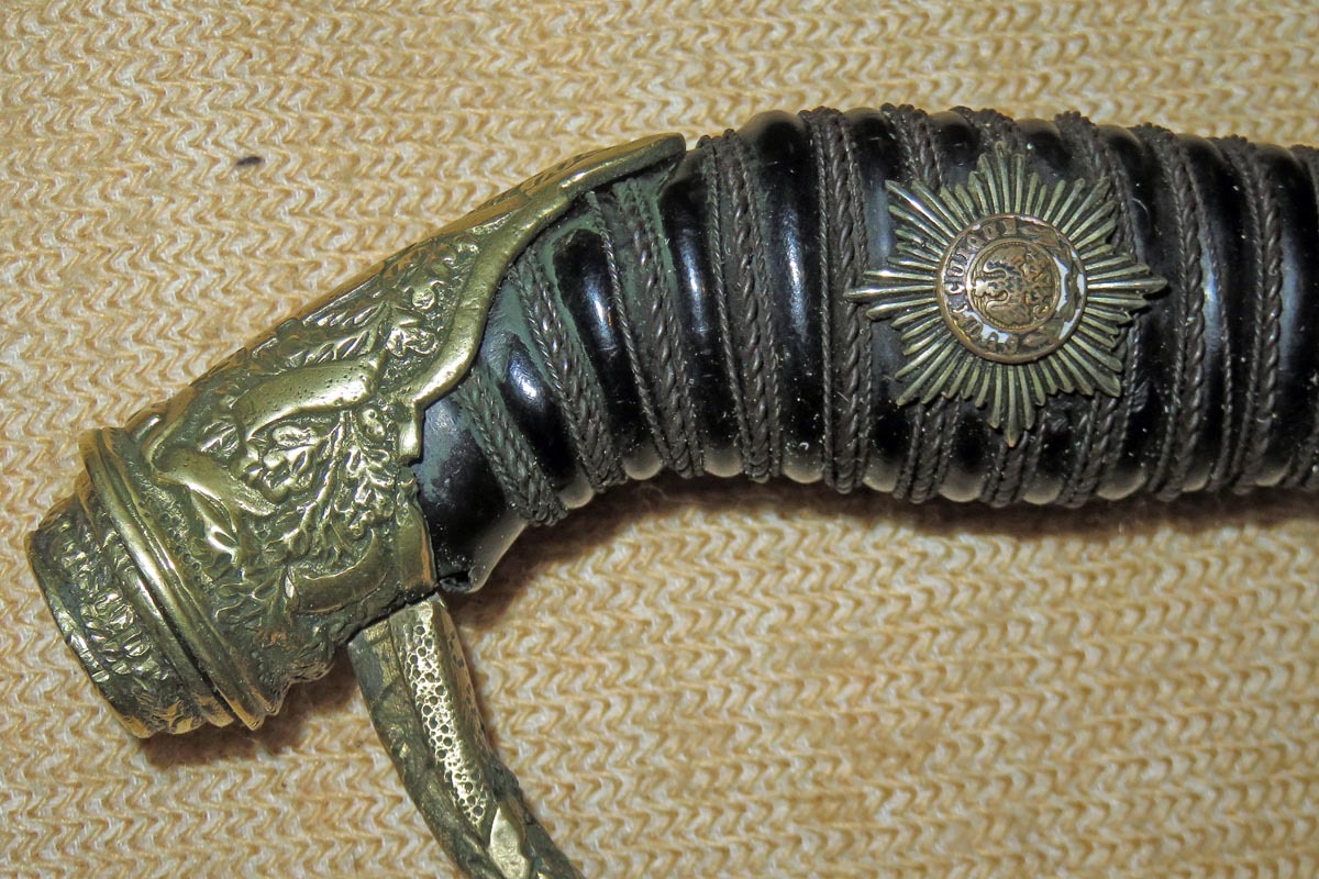Der originale preußische IOD hat ein reich verziertes Gefäß, einen Griff mit Gardestern und Fingerschlaufe, sowie eine schwarz brünierte Eisenscheide mit einem Tragering.