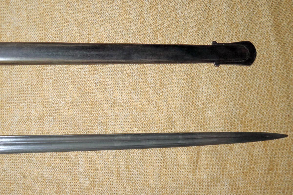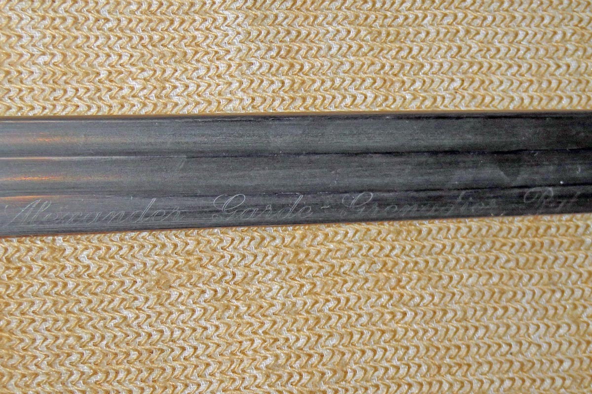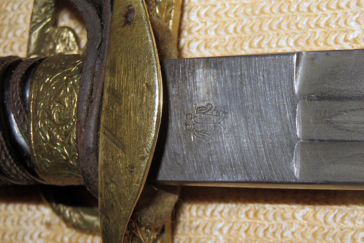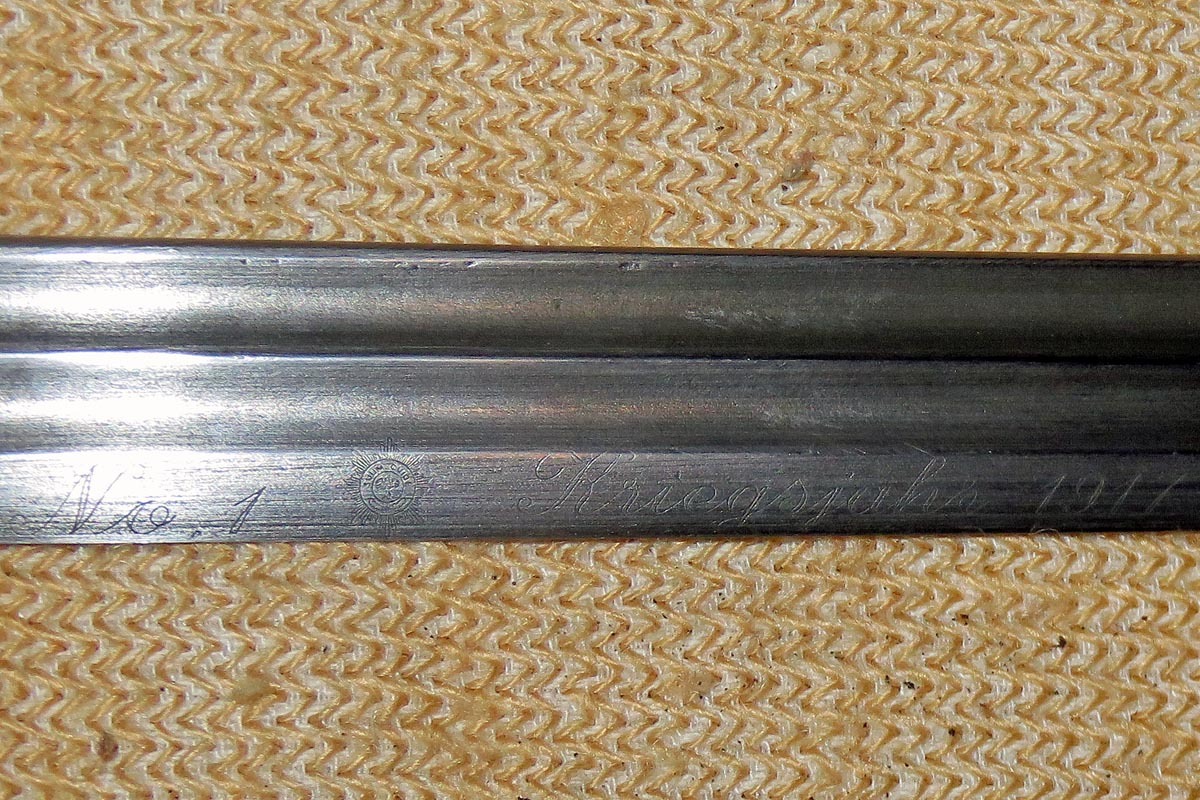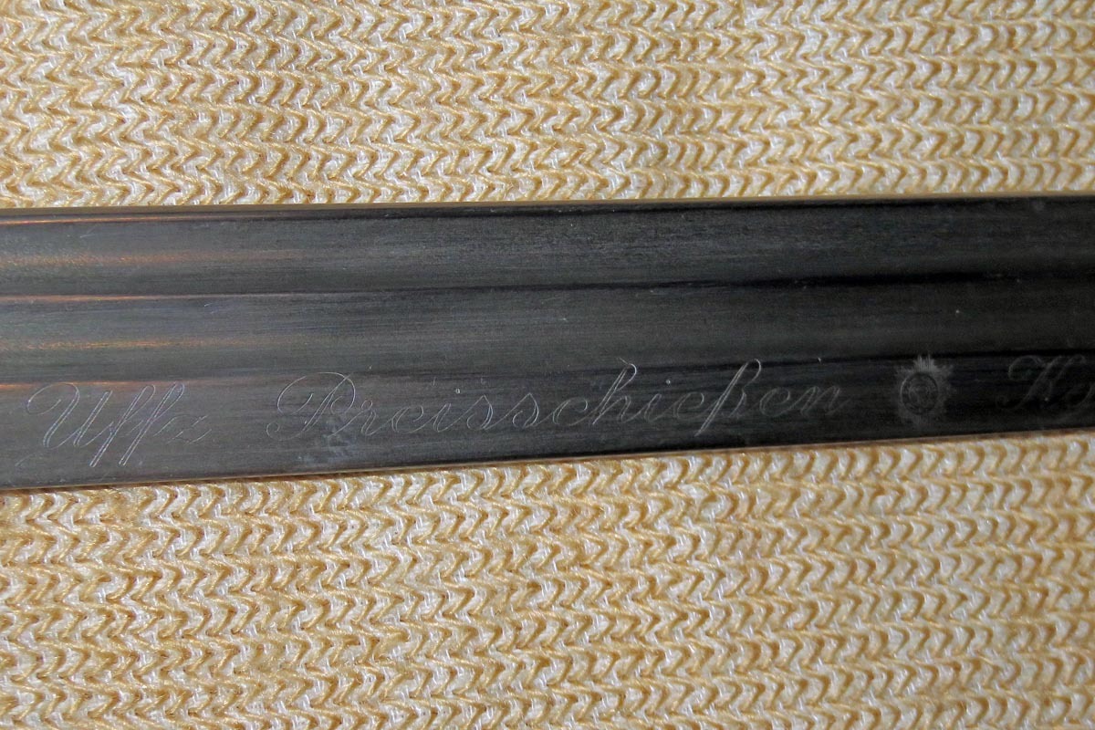 Die Klinge, ohne Nickel, mit beidseitig zweifacher Hohlkehle, ist mit Eickhornmarke, Stoßleder und leicht eingravierten Schriftzug des Preisschießens an der Schneide versehen (siehe Bilder).