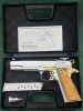 Eine IWG 1911 Government Sport Club cal. 9mm P.A. Knall, PTB 668 Verchromt/ Bedienelemente vergoldet mit tollen hellen Holzgriffen.