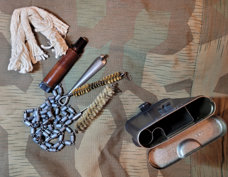 Das Reinigungsgerät RG34 ist ein authentisches Stück deutsche Geschichte, speziell konzipiert für die Wartung und Pflege von Karabinern 98k sowie Maschinengewehren der Wehrmacht. Originales, gebrauchtes Stück mit komplettem Inhalt. Die Reinigungsdochte sind nicht original, zum Rest kann ich keine Aussagen hinsichtlich Originalität machen, die Kette, Bürsten und Öler scheinen es aber zu sein. Hersteller cnx ohne Jahresstempel!