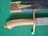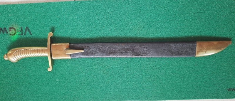 Messinggriffstück, Parierstange dicker als mein 2. Stück. Keine Truppenstempel vorhanden. Auf der Klinge keine Herstellerzeichen. Passende geschwärzte Lederscheide mit Messingbeschlägen. Hatte es badisches Infanterie Faschinenmesser M 1824 gekauft. Privatauktion ohne Gewährleistung, keine Garantie, keine Rücknahme.