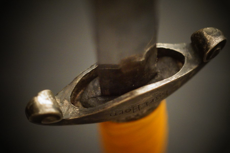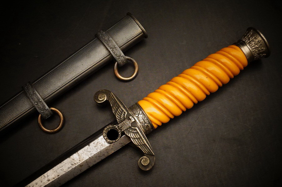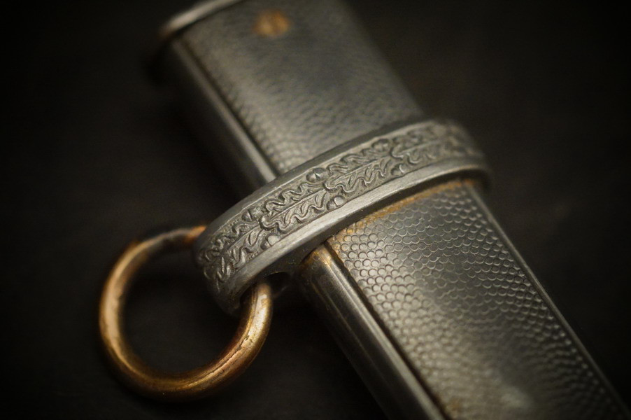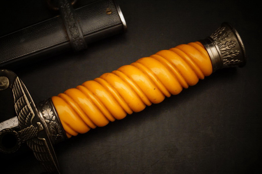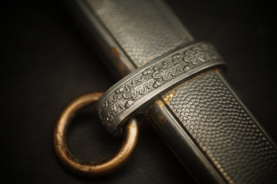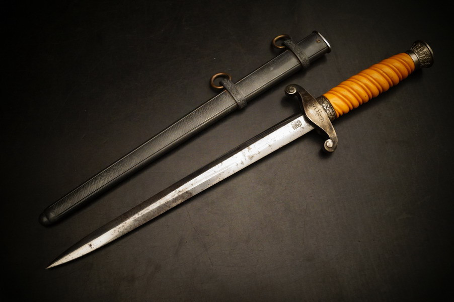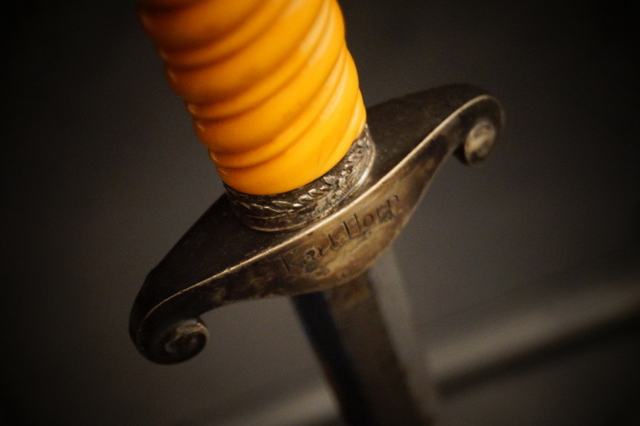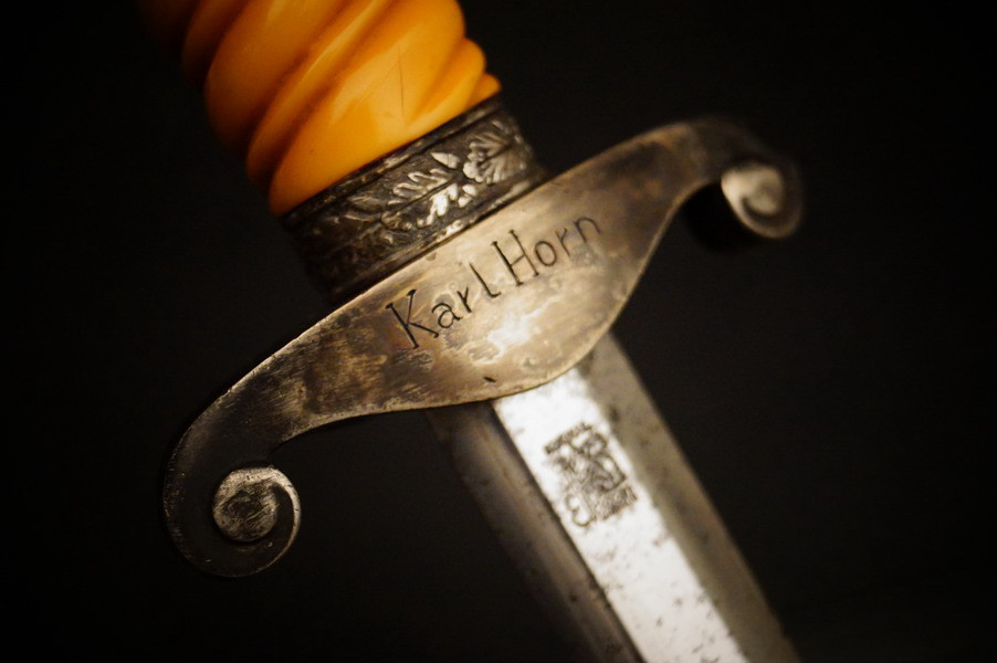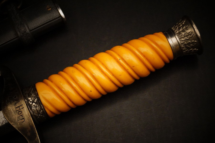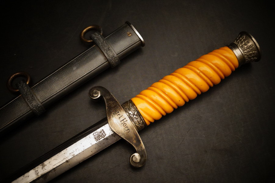 Fundzustand. Stahlscheide in perfektem Zustand und Klinge in unpoliertem gutem Zustand mit geprägtem Eickhorn Logo. Langes Griffstück ohne Schäden. Parierstange und Knauf mit Rgt. Und Namen. WK2