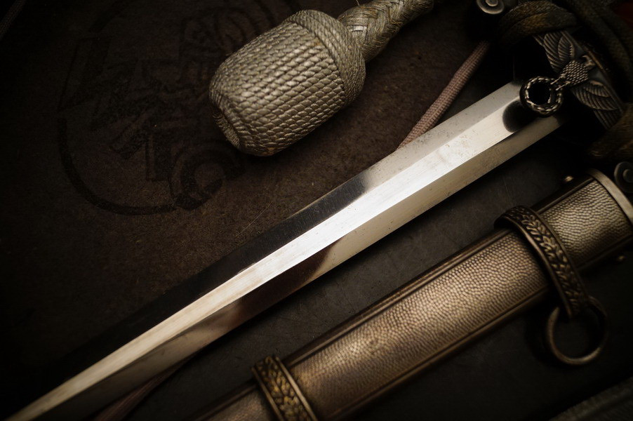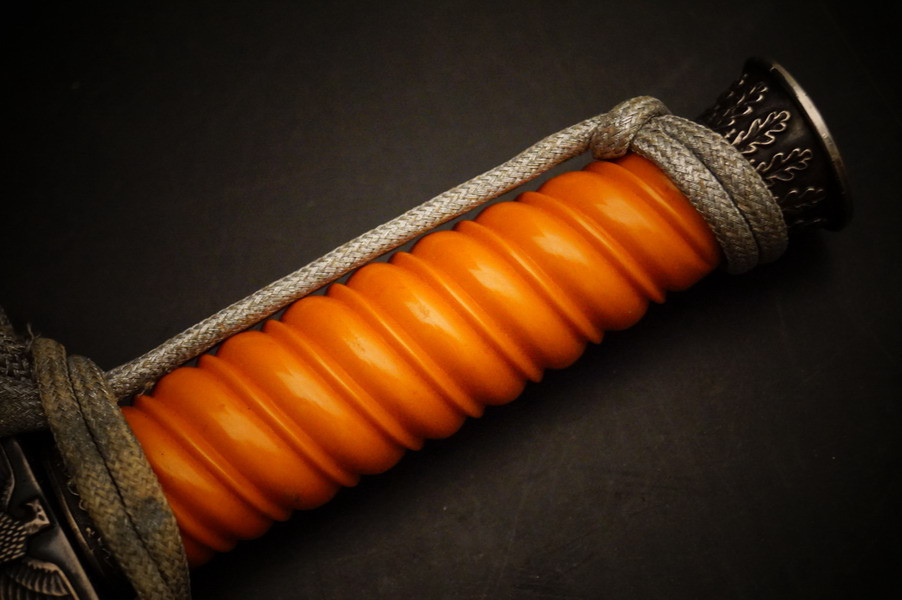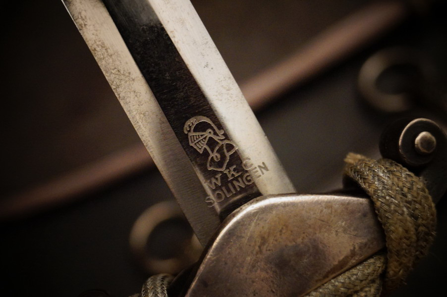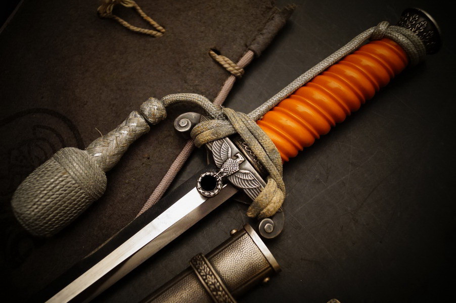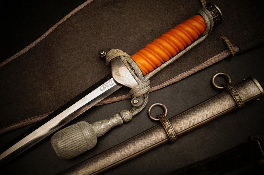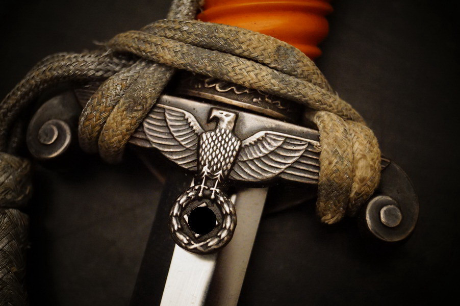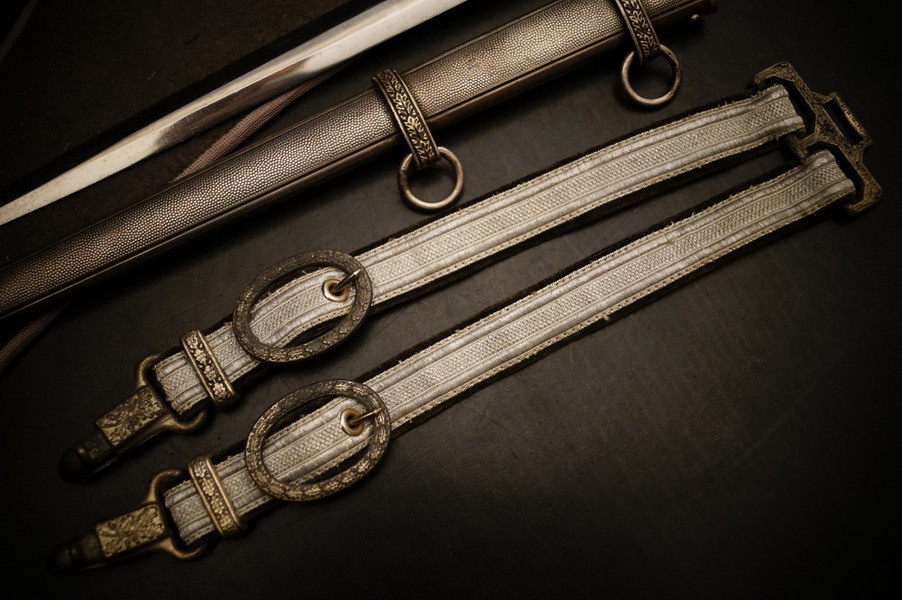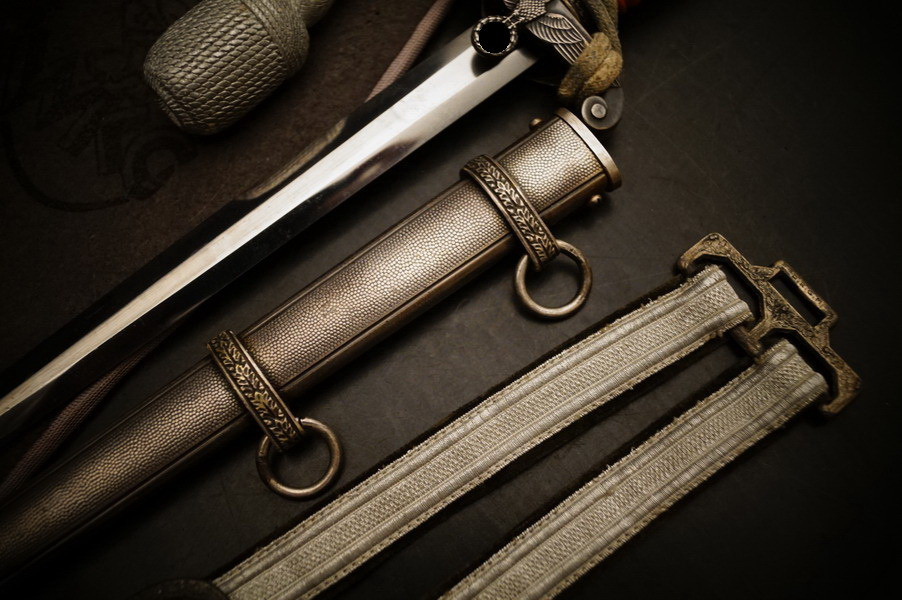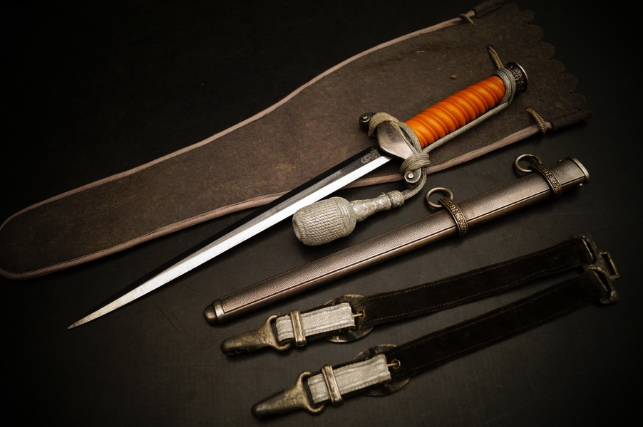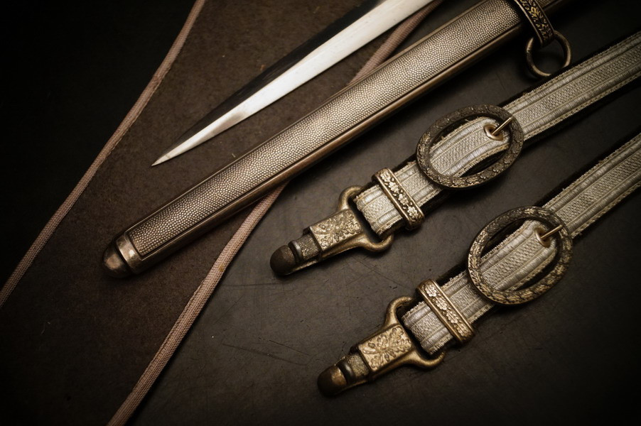 Fundzustand. Dolch in der seltenen Ausführung mit versilberter Neusilber-Parierstange ! Und Portepee und Luxus D.R.G.M. Gehänge sowie der dazugehörigen Dolchtasche von WKC. Schönes und sehr seltenes WH Dolch Exemplar aus Nachlass. WK2