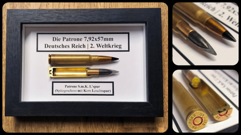 Sehr schöner Schaukasten mit Schnittmodell zur Veranschaulichung der bekannten Patrone 8x57 (7,92x57mm) der deutschen Wehrmacht.
